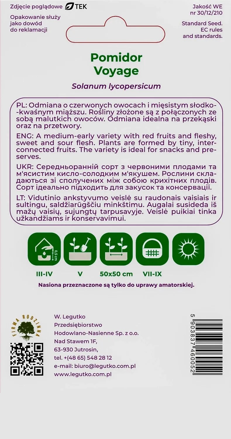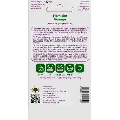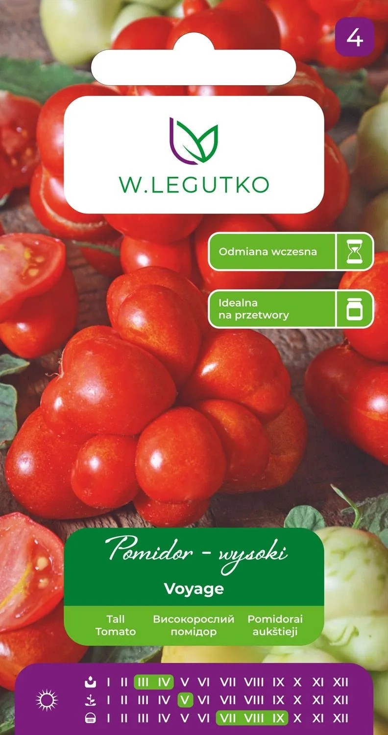 Pomidor gruntowy tyczny Voyage to odmiana o czerwonych owocach i mięsistym słodko -kwaśnym miąższu. Rośliny złożone są z połączonych ze sobą malutkich owoców. Odmiana idealna na przekąski oraz na przetwory.