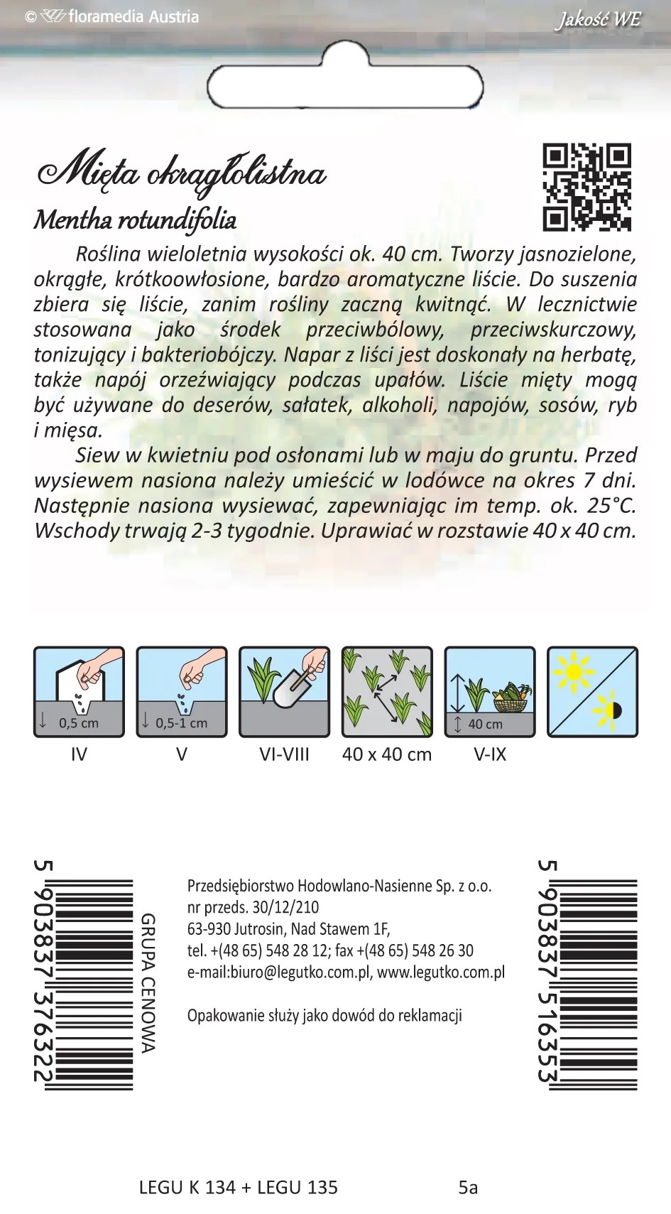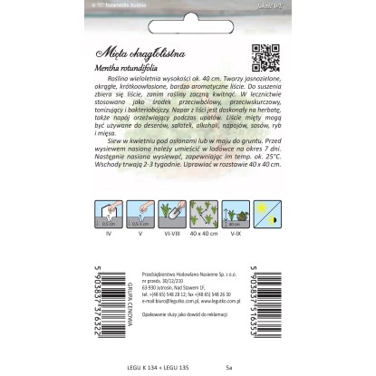 Roślina wieloletnia wysokości ok. 40 cm. Tworzy jasnozielone, okrągłe, krótkoowłosione, bardzo aromatyczne liści. Do suszenia zbiera się liście, zanim rośliny zaczną kwitnąć. W lecznictwie stosowana jako środek przeciwbólowy, przeciwskórczowy, tonizujący i bakteriobójczy. Napar z liści jest doskonały na herbatę, także napój orzeźwiający podczas upałów. Liście mięty mogą być używane do deserów, sałatek, alkoholi, napojów, sosów, ryb i mięsa. Siew w kwietniu pod osłonami lub w maju do gruntu. Przed wysiewem nasiona należy umieścić w lodówce na okres 7 dni. Następnie nasiona wysiewać, zapewniając im temp. ok. 25 stopni. Wschody trwają 2-3 tygodnie. Uprawiać w rozstawie 40x40 cm.