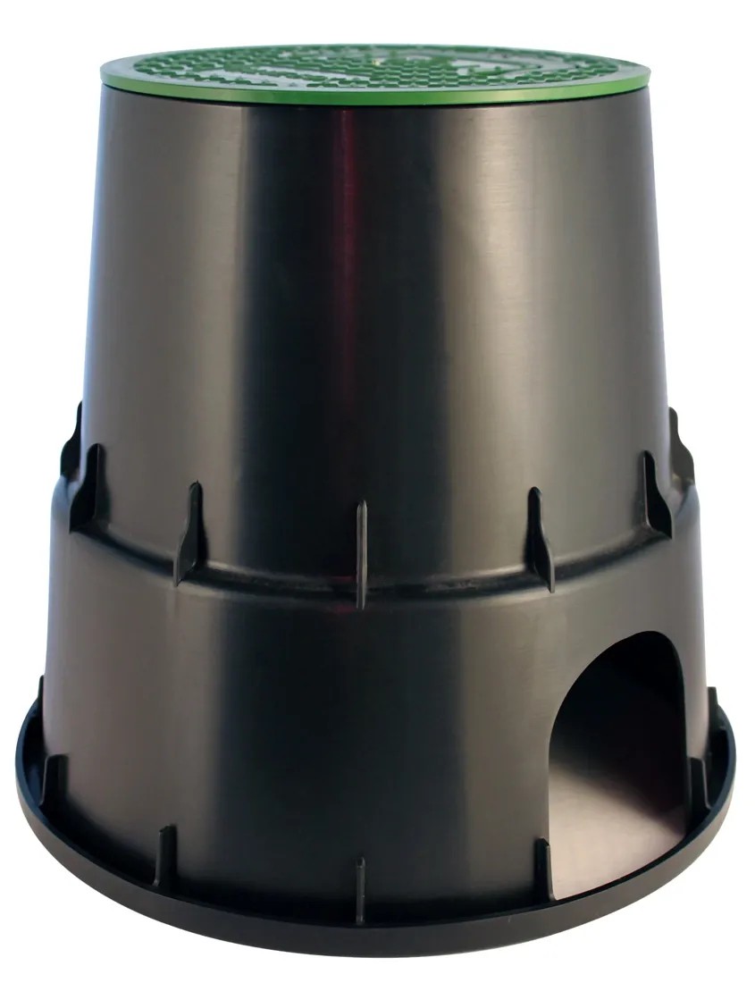 Skrzynka umożliwia ochronę i estetyczne ukrycie zaworów oraz urządzeń wykorzystywanych w systemach nawadniających. Górne wieko w kolorze zielonym dobrze wkomponowuje się w trawę.