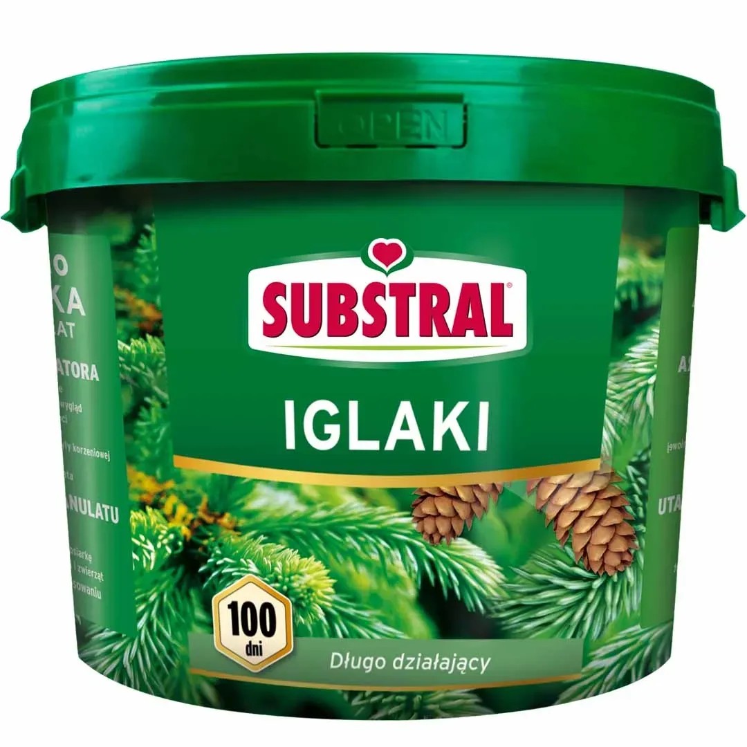 Nawóz do iglaków 100 dni 5 kg marki Substral to nawóz długo działający do iglaków i roślin kwaśnolubnych, który przeciwdziała brązowieniu igieł. Działa 3 razy dłużej i wydajniej niż zwykły granulat. Odżywia iglaki codziennie przez 100 dni, wystarczy jedno/ dwa nawożenia na sezon. Forma minigranulatu zapewnia równomierne nawożenie na całej powierzchni i sprawia, że nawóz szybciej się rozpuszcza i wchłania (duża wydajność).