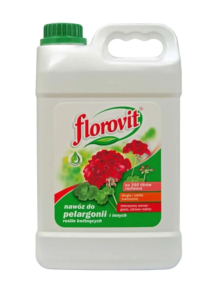 Nawóz do pelargonii 3 kg marki Florovit to wydajny koncentrat w płynie, który pozwala na uzyskanie 250 l roztworu.