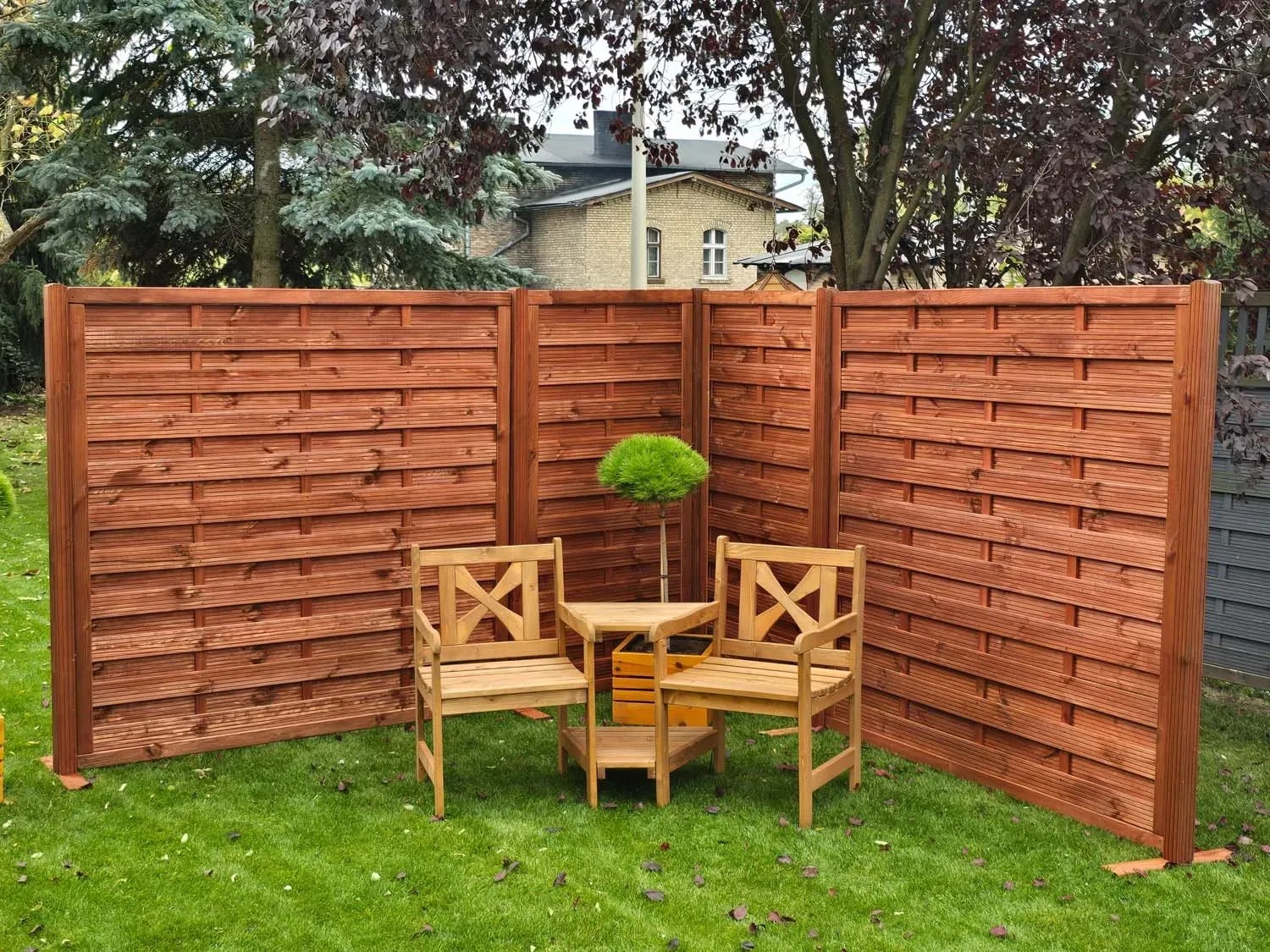 Trwałość produktu: produkt został zaprojektowany z myślą o długowieczności. Płoty w dolnej poziomej ramie mają wbudowane kanały odpływowe, które skutecznie zapobiegają zaleganiu wody, co znacząco wydłuża żywotność konstrukcji. Dzięki temu rozwiązaniu drewno pozostaje w lepszym stanie przez dłuższy czas, a płot jest bardziej odporny na czynniki atmosferyczne, które mogą przyspieszyć proces degradacji materiału.