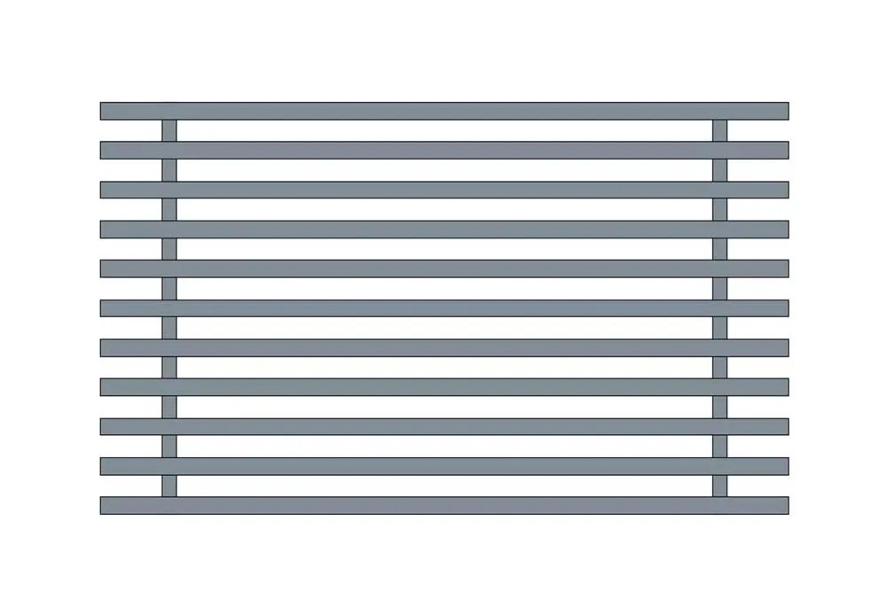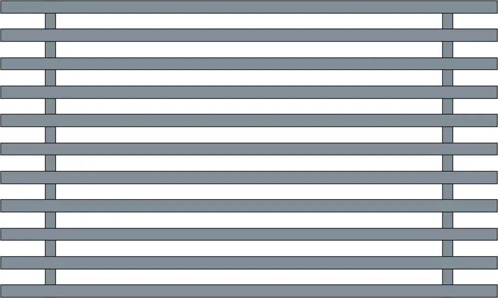 Przęsło Rimini składa się ze stalowych profili 40x20x1,5 mm, poziomych profili 30x15x1,5 mm stanowiących punkty montażowe przęsła oraz profili poprzecznych 50x10x1 mm. Zastosowane rozwiązanie ma bezpośredni wpływ na sztywność i stabilność konstrukcji przy wadze na poziomie 24 kg. Cały zestaw montowany jest do słupów stalowych lub betonowych za pomocą dedykowanych uchwytów. Produkt występuje bez mocowań w zestawie. Rekomendujemy zakup uchwytu umożliwiającego mocowanie przęsła ze słupkiem pasującego do serii Rimini.