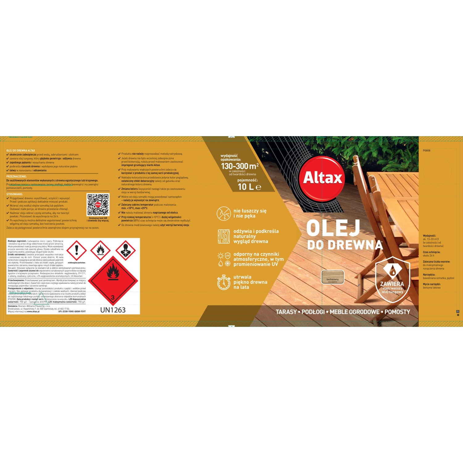 Olej jest produktem bardzo wydajnym, składającym się z mieszaniny olejów naturalnych, najwyższej jakości, do malowania krajowego i egzotycznego drewna, zarówno wewnątrz, jak i na zewnątrz pomieszczeń. Dzięki doskonałemu składowi, preparat podkreśla i wydobywa naturalne piękno drewnianych powierzchni. Jego niewątpliwą zaletą jest to, iż wnika bardzo głęboko w strukturę drewna, chroniąc je przed czynnikami atmosferycznymi, takimi jak: wilgoć, woda, śnieg oraz promieniowanie UV. Produkt zapobiega wysychaniu i pękaniu drewna, a także umożliwia jego oddychanie.
