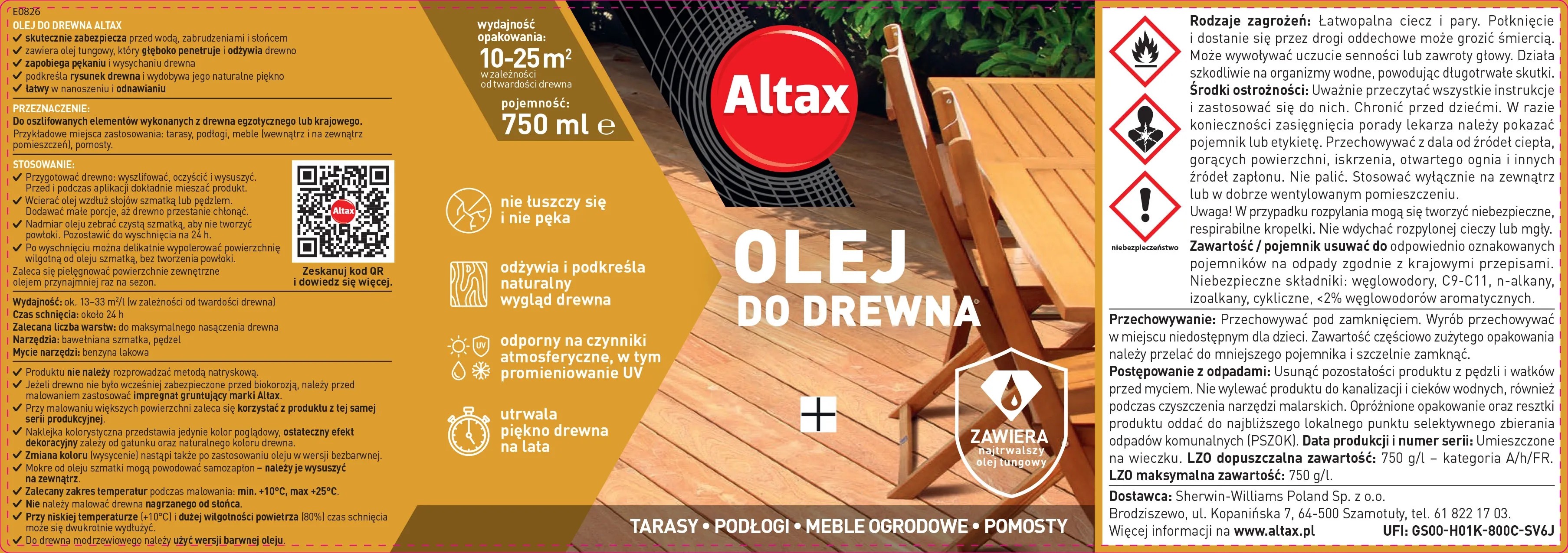 Olej jest produktem bardzo wydajnym, składającym się z mieszaniny olejów naturalnych, najwyższej jakości, do malowania krajowego i egzotycznego drewna, zarówno wewnątrz, jak i na zewnątrz pomieszczeń. Dzięki doskonałemu składowi, preparat podkreśla i wydobywa naturalne piękno drewnianych powierzchni. Jego niewątpliwą zaletą jest to, iż wnika bardzo głęboko w strukturę drewna, chroniąc je przed czynnikami atmosferycznymi, takimi jak: wilgoć, woda, śnieg oraz promieniowanie UV. Produkt zapobiega wysychaniu i pękaniu drewna, a także umożliwia jego oddychanie.