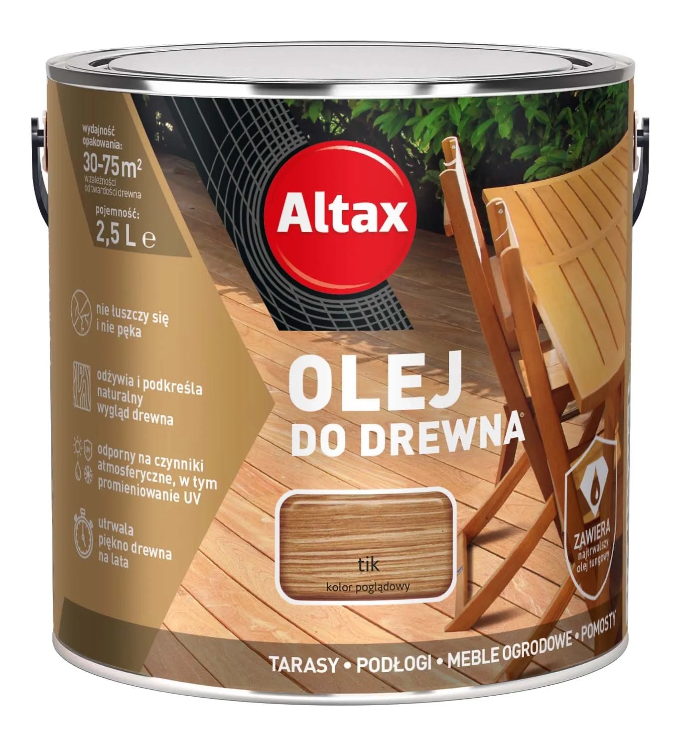 Olej jest produktem bardzo wydajnym, składającym się z mieszaniny olejów naturalnych, najwyższej jakości, do malowania krajowego i egzotycznego drewna, zarówno wewnątrz, jak i na zewnątrz pomieszczeń. Dzięki doskonałemu składowi, preparat podkreśla i wydobywa naturalne piękno drewnianych powierzchni. Jego niewątpliwą zaletą jest to, iż wnika bardzo głęboko w strukturę drewna, chroniąc je przed czynnikami atmosferycznymi, takimi jak: wilgoć, woda, śnieg oraz promieniowanie UV. Produkt zapobiega wysychaniu i pękaniu drewna, a także umożliwia jego oddychanie.