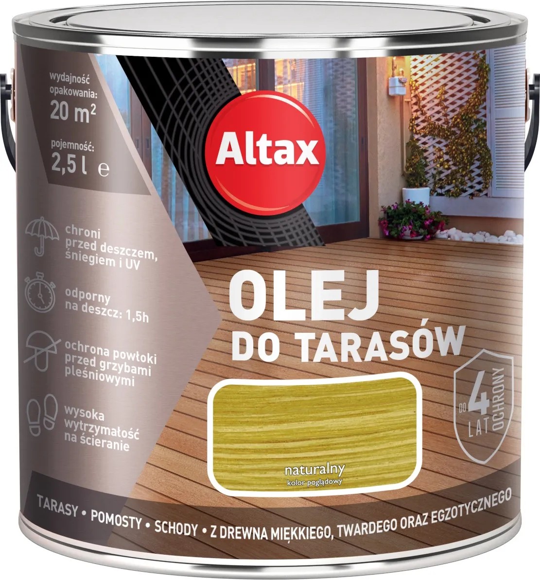 Olej można stosować do drewnianych tarasów, pomostów i schodów. Zapewnia skuteczną ochronę przed deszczem, śniegiem i UV, a także przed grzybami pleśniowymi. Odporność na deszcz zyskuje już po 1,5 godziny.
