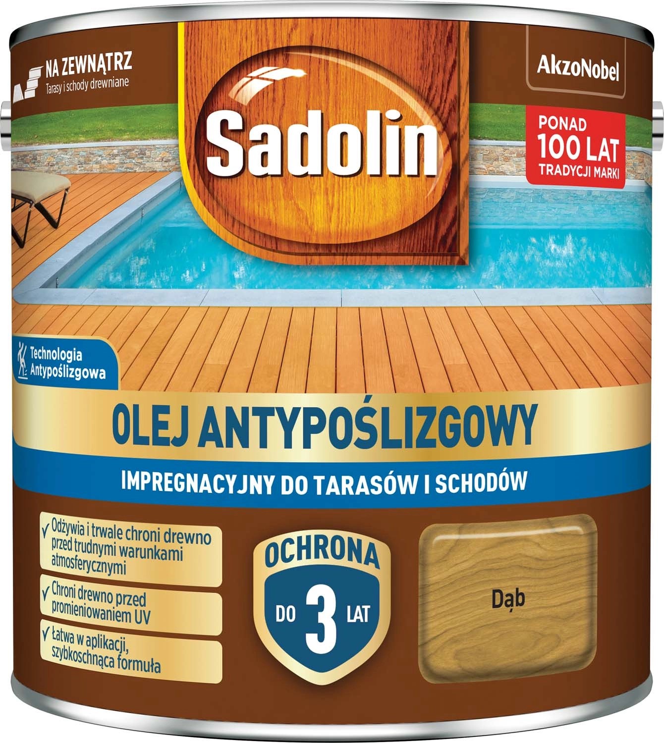 Sadolin Olej Antypoślizgowy impregnacyjny do tarasów i schodów to nowoczesny produkt stworzony z myślą o poziomych powierzchniach drewnianych na zewnątrz, gdzie oczekiwana jest zarówno długotrwała ochrona drewna jak i właściwości antypoślizgowe.
