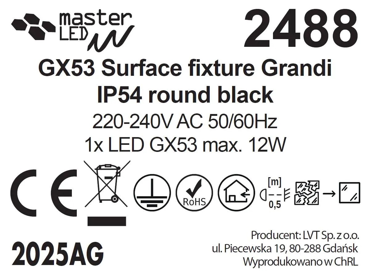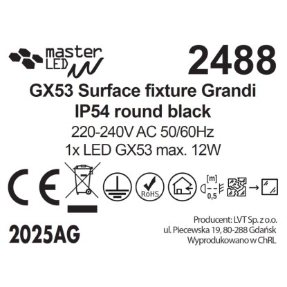 Źródło światła stanowi jedna żarówka LED z gwintemGX53 o mocy max. 12W. Produkt sprzedawany jest bez źródła światła w zestawie, należy je zakupić oddzielnie.
