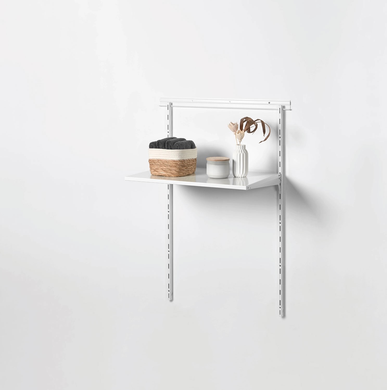 Elementy do montażu garderoby dostępne są w dwóch ponadczasowych kolorach - białym i czarnym - co pozwala dopasować ją do różnorodnych wnętrz. Można także łączyć kolory elementów, by uzyskać modny, oryginalny efekt aranżacyjny w nowoczesnym stylu, na przykład poprzez połączenie czarnych wsporników z białą półką.