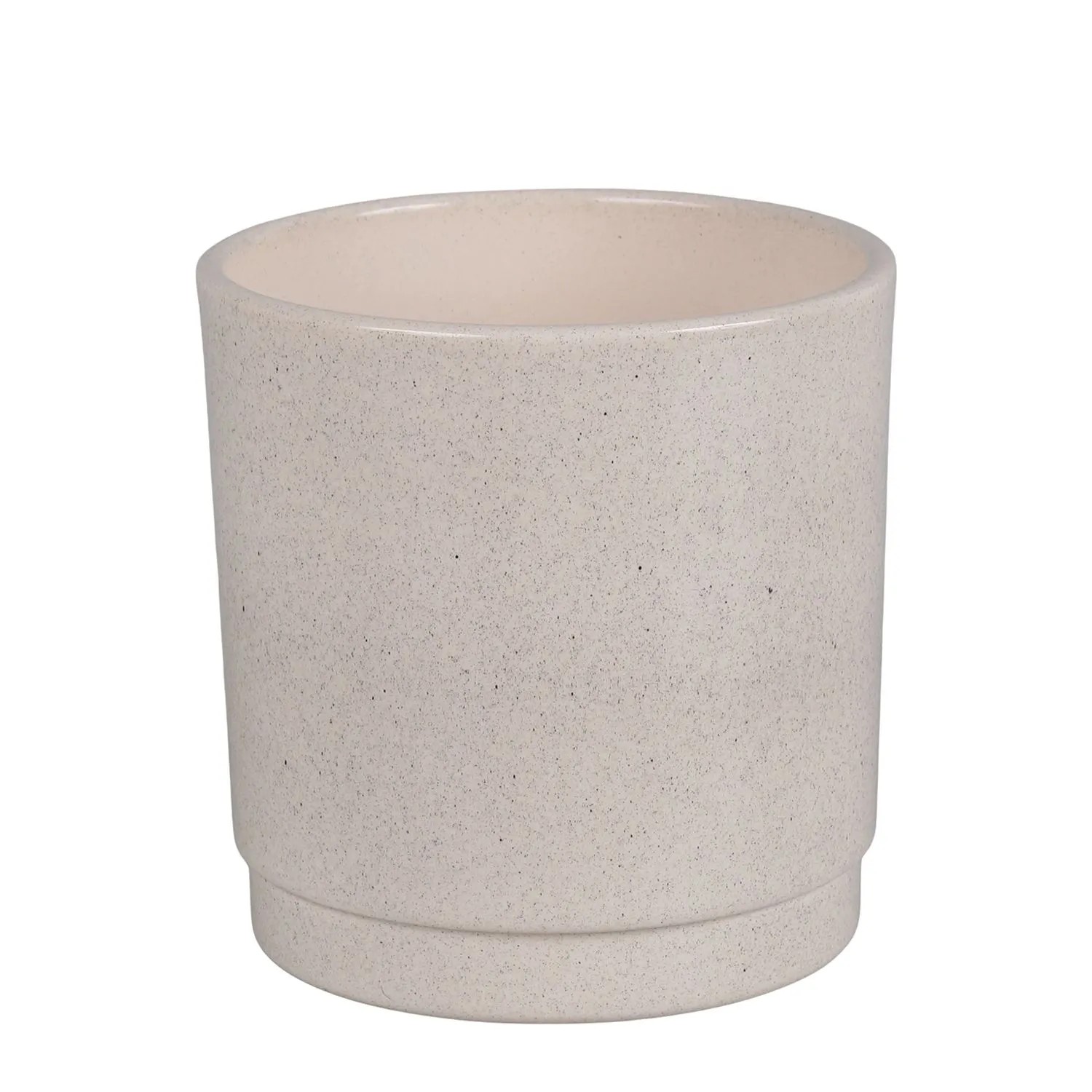Osłonka ceramiczna o średnicy 13,5 cm w kolorze kamiennym beżowym. Produkt przeznaczony do aranżacji wewnętrznej.