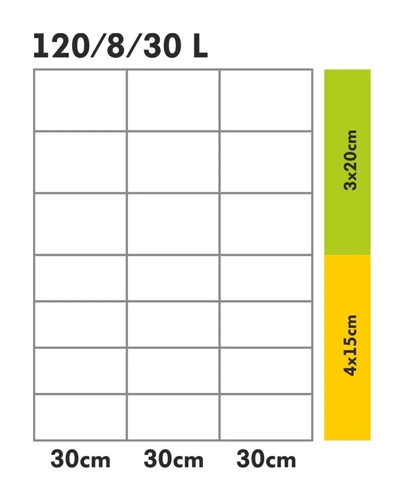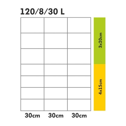Specyfikacja oczek od dołu siatki: 4 oczka wys. 15 cm, 3 oczka wys. 20 cm
