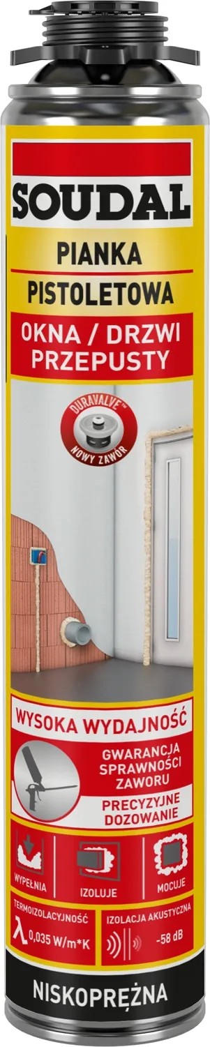 Pianka montażowa pistoletowa Okna & Drzwi marki Soudal jest przeznaczona do wszelkich prac wykończeniowych instalacyjnych w temperaturze powyżej 0°C. Pianka poliuretanowa charakteryzuje się obniżoną rozprężalnością, krótkim czasem utwardzania i przyczepnością do większości materiałów budowlanych, takich jak: cegła, beton, kamień, tynk, drewno, PCV, aluminium. Sprawdzi się jako materiał termoizolacyjny i dźwiękoszczelny do prac montażowych i wykończeniowych.