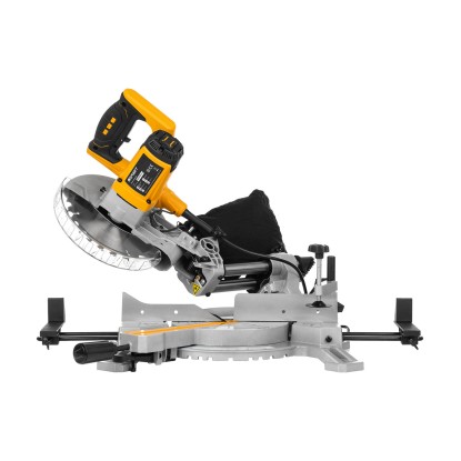 W zestawie znajdują się dwie tarcze pilarskie z węglika spiekanego: jedna 24-zębna do szybkiego cięcia, druga 48-zębna do cięć precyzyjnych. Metalowy zacisk zapewnia pewne unieruchomienie obrabianego przedmiotu, natomiast worek na pył i adapter do odkurzacza pozwalają utrzymać porządek i czyste powietrze na stanowisku pracy.