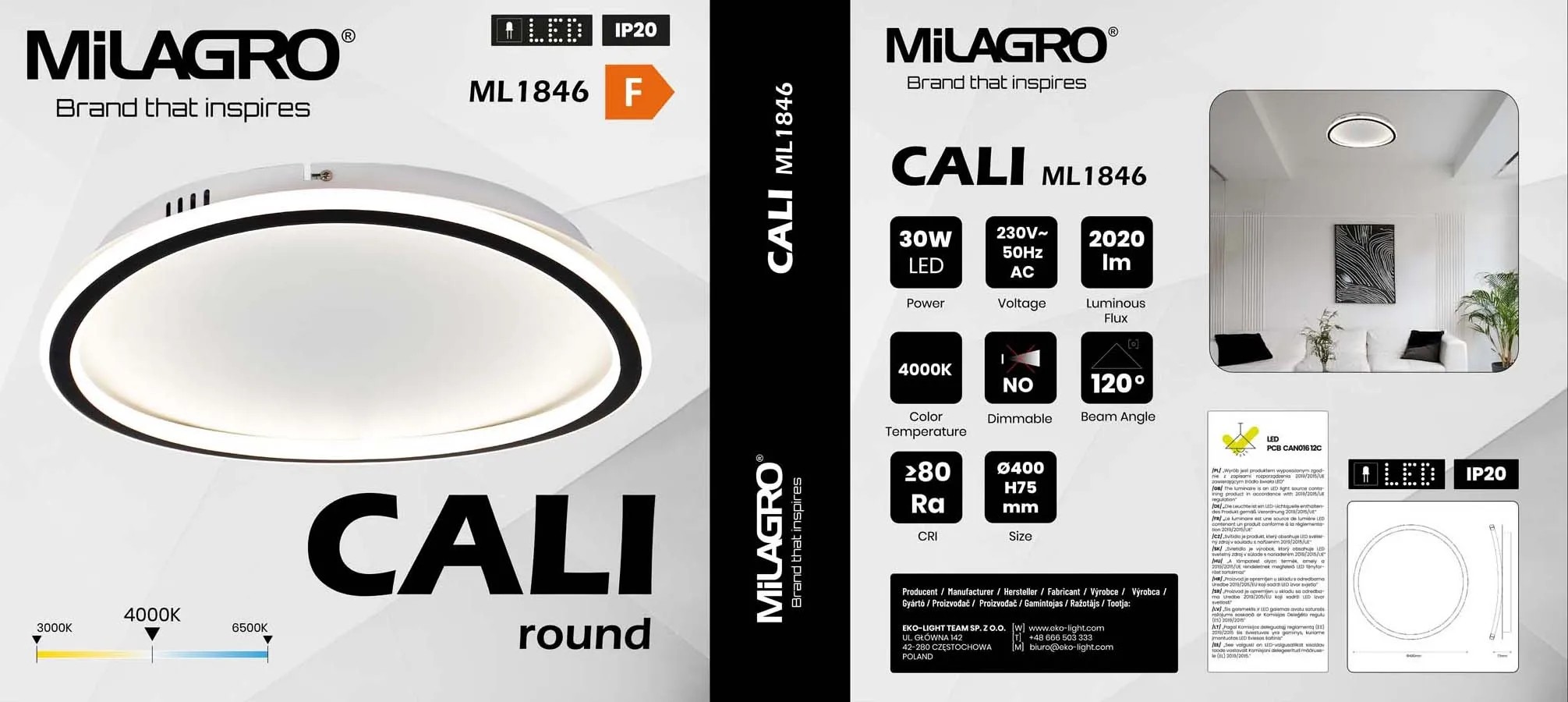 Źródło światła LED o mocy 30W emituje strumień świetlny na poziomie 2020 lumenów o neutralnej białej barwie w temperaturze 4000K, najbardziej zbliżonej do naturalnego światła dziennego.