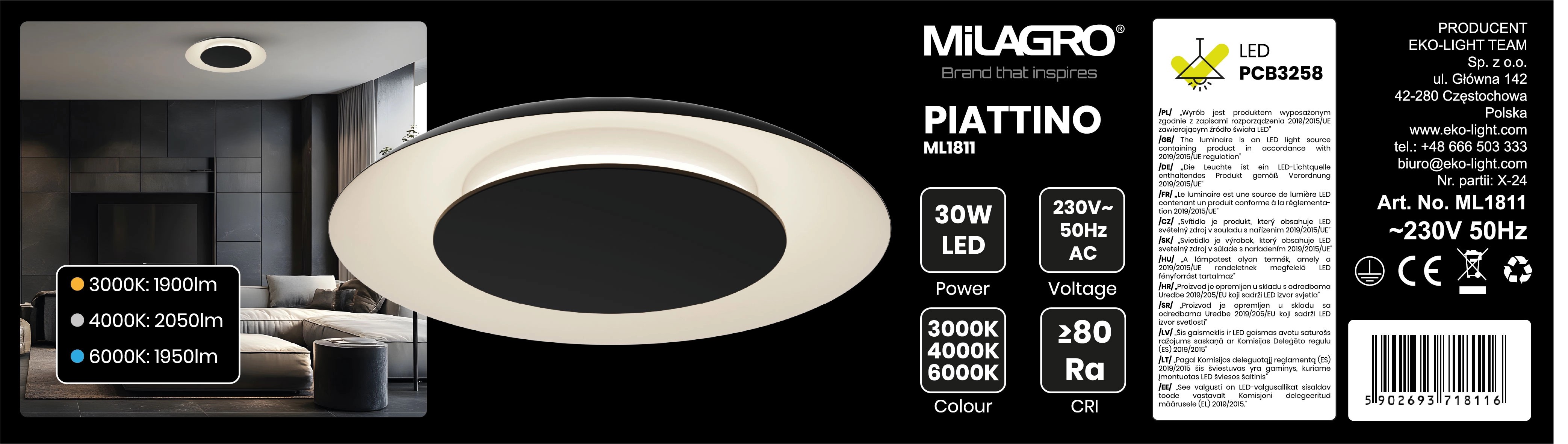 Źródło światła LED o mocy 30W emituje strumień świetlny na poziomie 1900 lumenów przy świetle ciepłym 3000K, 2050 lumenów przy neutralnym białym 4000K, lub 1950 lumenów dla chłodnej bieli o temperaturze 6000K.