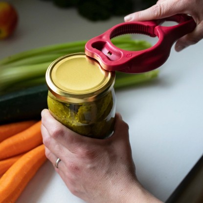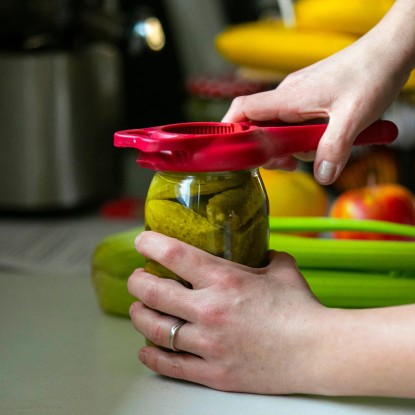 Otwieracz jest niezwykle prosty w użyciu. Wystarczy lekko podważyć zaczepem zakrętkę, co pozwala wpompować powietrze pod wieczko i wyrównać ciśnienie w słoiku. Następnie wystarczy nałożyć otwieracz na zakrętkę i odkręcić, trzymając uchwyt blisko zakrętki. Specjalnie zaprojektowany wewnętrzny ząbek stabilizuje narzędzie na wieczku, co ułatwia cały proces i zapobiega ślizganiu się.