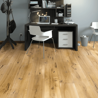 Wykonana z prawdziwego drewna deska podłogowa Dąb Vintage to produkt naturalny i szlachetny. Podłogi drewniane nie tylko są trwalsze, ale też zdrowsze od sztucznych imitacji. Są idealnym rozwiązaniem dla alergików, ponieważ nie elektryzują się, nie przyciągają kurzu ani roztoczy, a dodatkowo są przyjemnie ciepłe w dotyku w przeciwieństwie do paneli. Deska podłogowa Dąb Vintage posiada szczotkowaną powierzchnię, która jest pokryta lakierem matowym. Lakier matowy pogłębia wrażenie ciepła i przytulności. Drewnianą podłogę należy odpowiednio pielęgnować, jednak deski pokryte lakierem są mniej wymagające i nie potrzebują częstej konserwacji. Deska podłogowa marki Berlinek daje również możliwość kilkukrotnego szlifowania i wielokrotnej renowacji lakieru, dzięki czemu będzie służyć przez wiele lat. Z kolei krawędzie z mikro V-fugą podkreślają naturalność deski i sprawiają, że będzie prezentować się efektownie w salonie, przedpokoju czy innych pomieszczeniach domowych.
