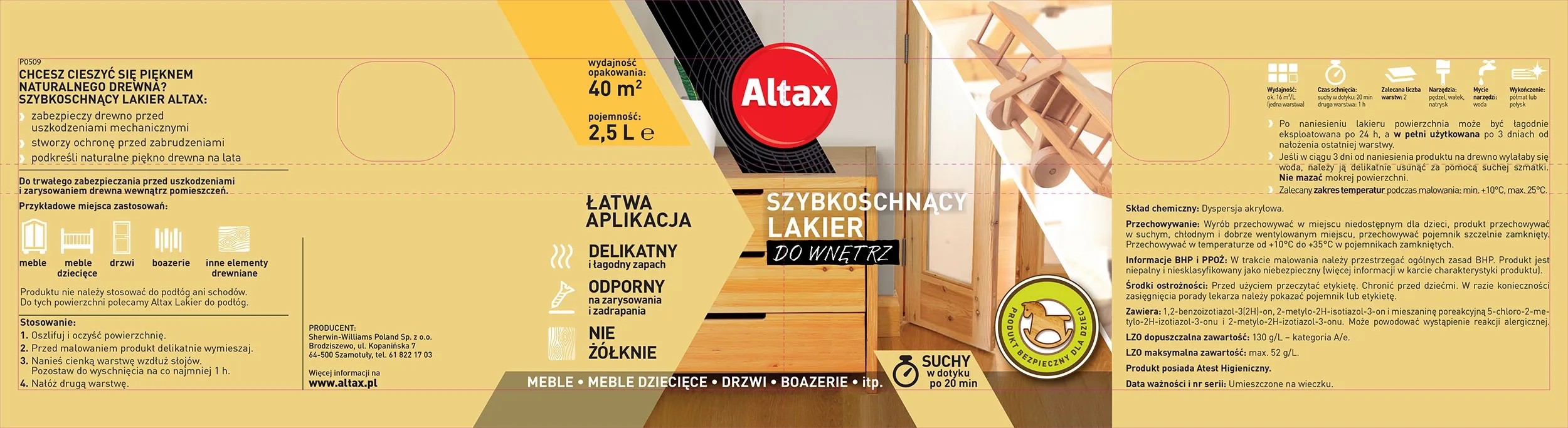 Lakier przeznaczony jest do stosowania wewnątrz pomieszczeń do zabezpieczania mebli, drzwi, boazerii i innych drewnianych powierzchni. Nie należy stosować do podłóg lub schodów. Lakier Altax charakteryzuje się bardzo krótkim czasem schnięcia. Jest suchy w dotyku już po 20 minutach, a drugą warstwę można nanosić już po godzinie. Produkt jest dostępny w wersjach: półmat i połysk.