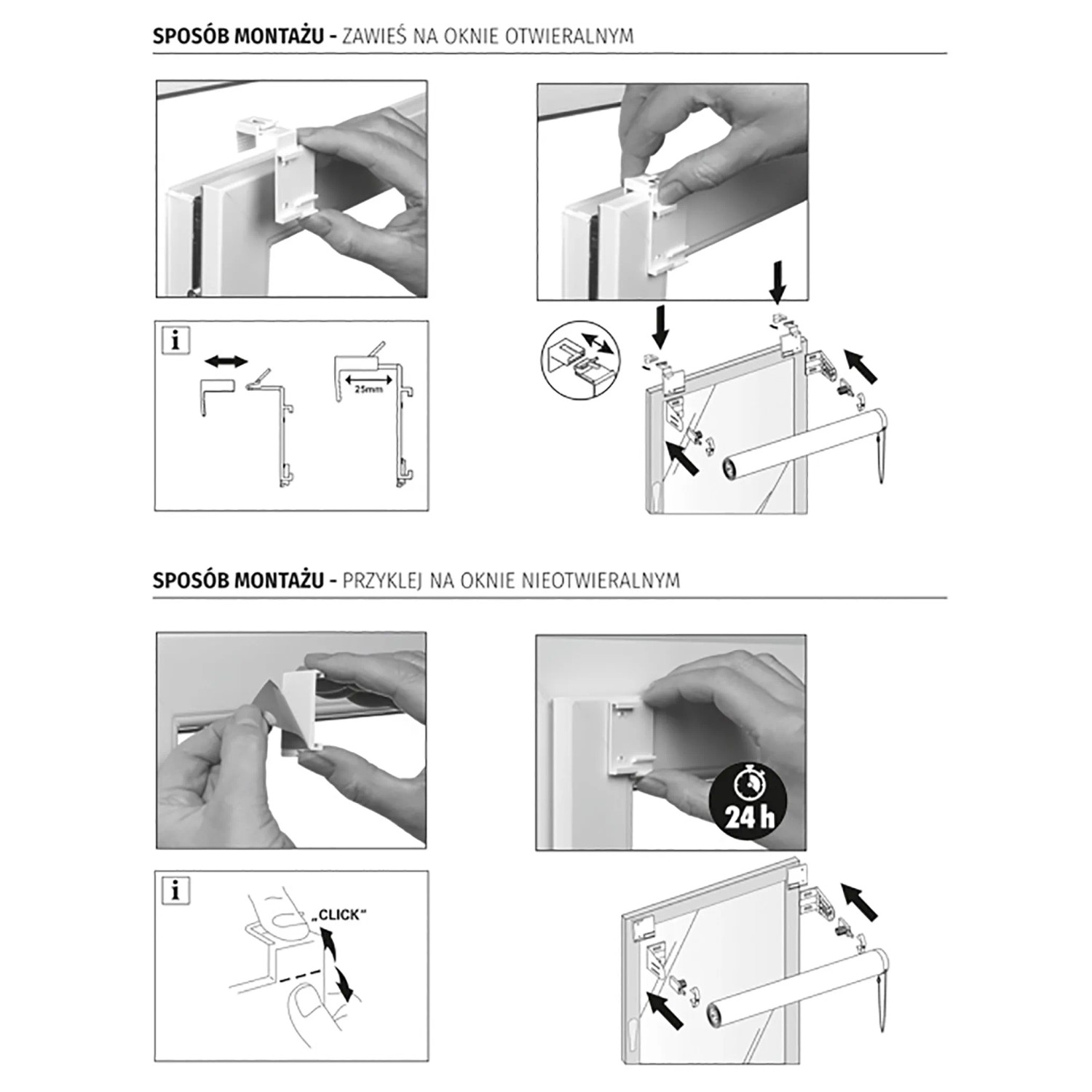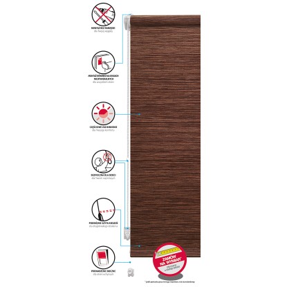 Roleta przeznaczona jest do instalowania na skrzydle okna przy pomocy zaciskowych wieszaków naokiennych lub samoprzylepnych płytek montażowych. Nie wymaga wiercenia, montaż jest bezinwazyjny. Strzępieniu rolety zapobiega kieszeń obciążnika zaszywana z podwójnym podwinięciem. Mechanizm napędowy można zainstalować z prawej lub z lewej strony. W komplecie jest bezpieczny zrywacz łańcuszka, który powoduje jego rozpięcie po przekroczeniu określonej siły. Napinacz zaś porządkuje bieg łańcuszka, utrzymuje go przy ramie okna oraz umożliwia obsługę rolety jedną ręką. Rura nawojowa ma średnicę 18 mm, do zawieszenia lub przyklejenia do skrzydła okna. Wyposażenie rolety spełnia normę EN13120 dotyczącą bezpieczeństwa użytkowania zasłon wewnętrznych.