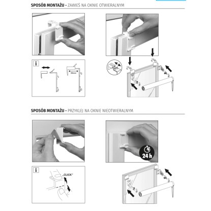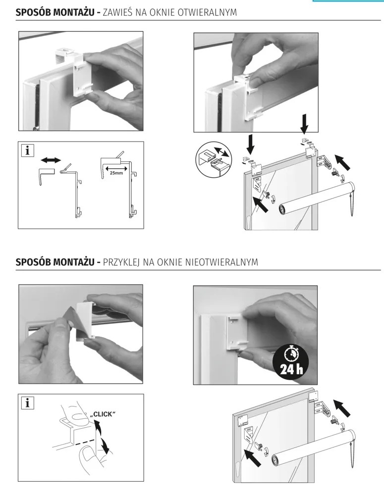 Roletę zamontujesz w prosty, szybki sposób na skrzydle okna. Montaż odbywa się za pomocą zaciskowych wieszaków. Konstrukcja zapewnia bezinwazyjną instalację do każdego rodzaju okna, bez konieczności używania jakichkolwiek narzędzi i urządzeń. Mechanizm napędowy rolety można zamocować z prawej lub lewej strony. W zestawie znajduje się boczne prowadzenie żyłkowe i obciążnik.