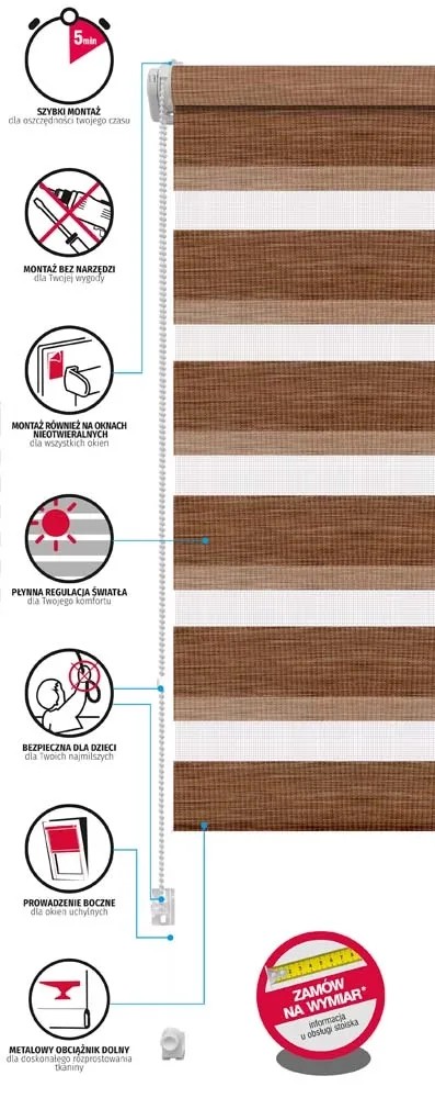 Roletę należy montować na skrzydle okiennym za pomocą zaciskowych wieszaków. Konstrukcja elementów montażowych zapewnia bezinwazyjny i prosty montaż do każdego rodzaju okna bez używania jakichkolwiek narzędzi i urządzeń. Jest możliwość nie tylko zawieszenia, ale także przyklejenia do okna bądź montażu na wkręty. Koralikowy, samohamowny mechanizm napędowy pozwala na precyzyjną regulację położenia tkaniny. Można go zainstalować zarówno z prawej, jak i lewej strony. Seria rolet Zebra wyróżnia się wysokim komfortem użytkowania, jak i szybkim, bezproblemowym montażem. Na komfort wpływa także boczne prowadzenie żyłkowe, metalowy obciążnik tkaniny oraz napinacz łańcuszka, element porządkujący jego bieg, utrzymujący łańcuszek przy ramie okna oraz umożliwiający obsługę rolety jedną ręką. Z takim zabezpieczeniem można swobodnie otwierać okno bez obaw o przypadkowe zrzucenie przedmiotów znajdujących się w pobliżu.