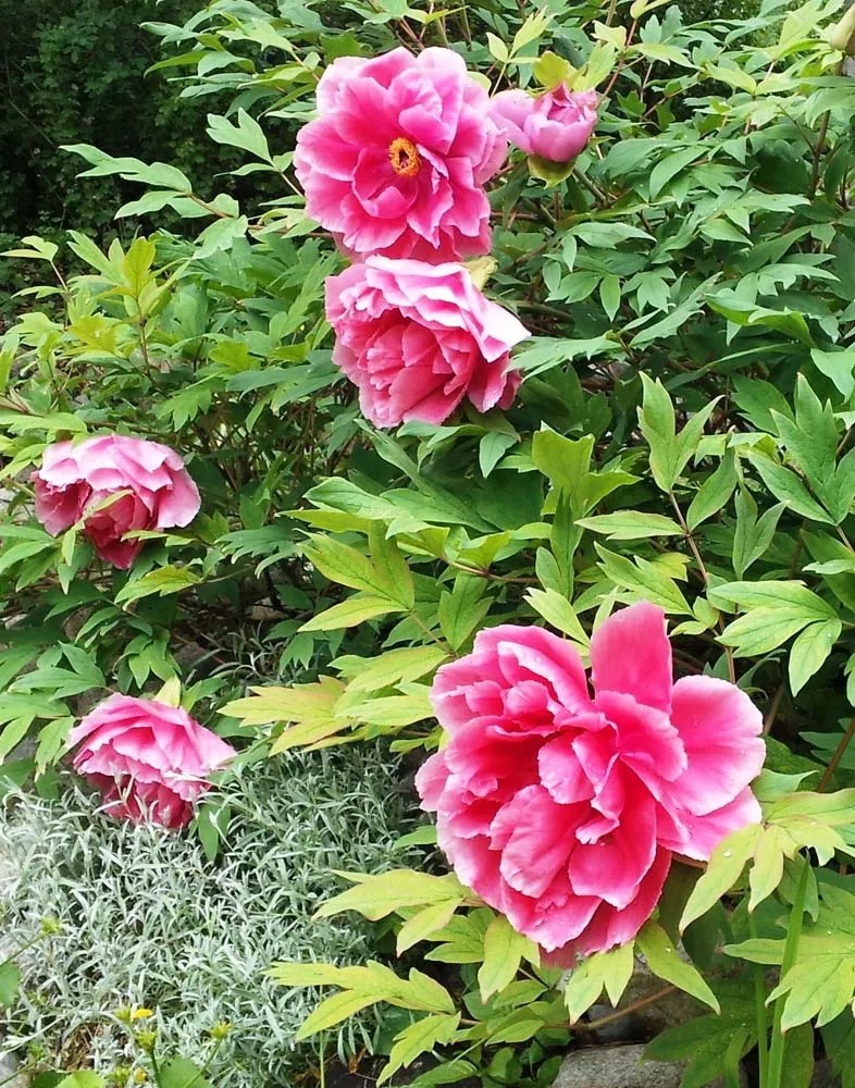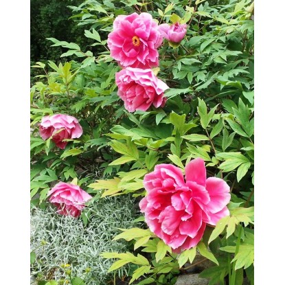 Piwonia drzewiasta- ogrodowy krzew liściasty dorastający do ok. 1,5m. Różne odmiany kolorystyczne. kwiaty wyjątkowo duże - nawet do 15 cm średnicy. Kwitnie maj - czerwiec. Liście jesienią barwią się na kolor żółty. Krzew wymaga okrycia na zimę. Stanowisko słoneczne, półcieniste - zaciszne. Podłoże żyzne, zasobne w próchnicę i wilgotne, lekko kwaśne. Wskazane systematyczne nawożenie - nawóz z dużą zawartością potasu sprzyja tworzeniu dużych kwiatów. Silne sadzonki, 3 pędy w don. 5l