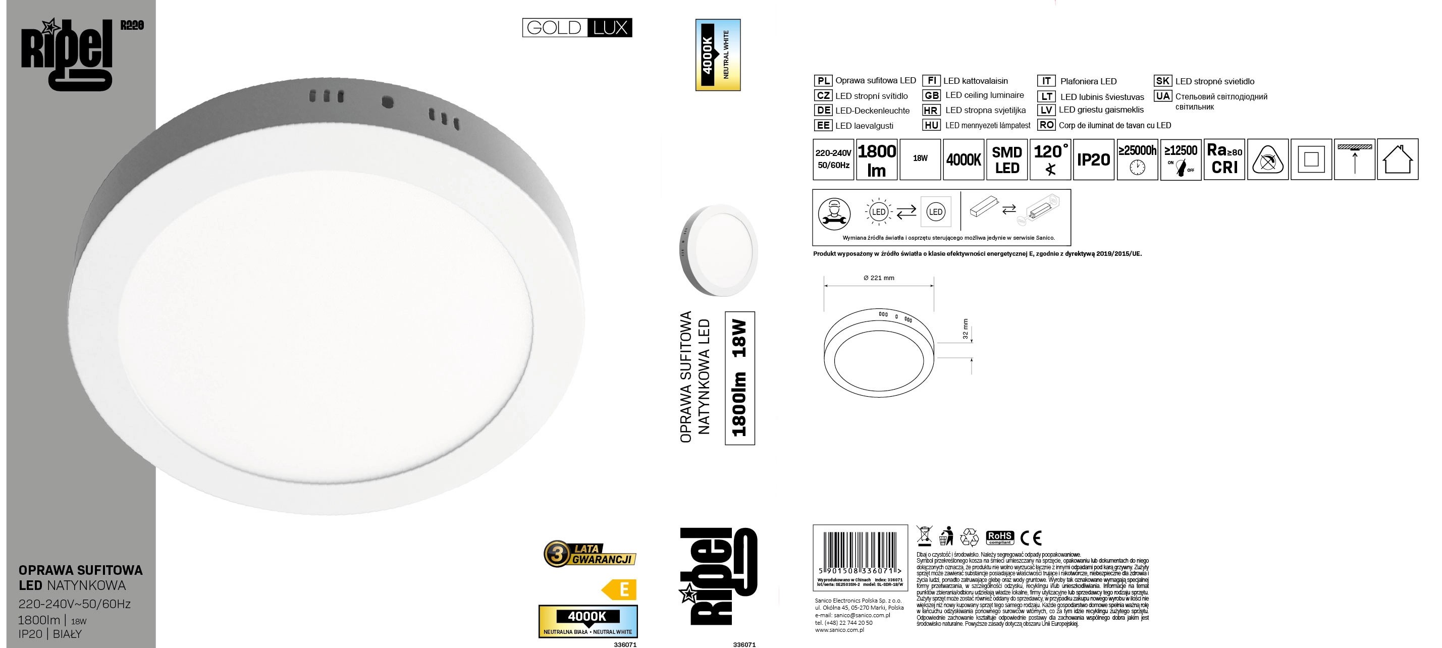 Zastosowane diody LED charakteryzują się wysoką skutecznością świetlną oraz bardzo długą żywotnością - do 25000 godzin pracy. Źródło światła o mocy 18W emituje strumień świetlny na poziomie 1800 lumenów.