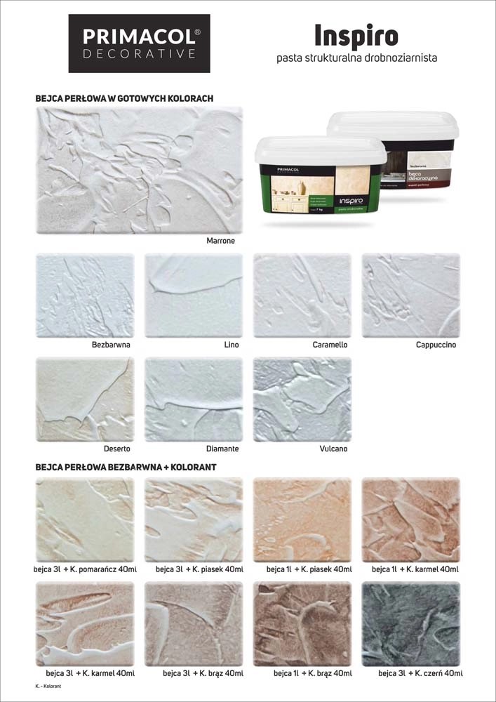 Drobnoziarnista pasta strukturalna Inspiro marki Primacol do nadawania ścianom i sufitom niepowtarzalnej struktury.