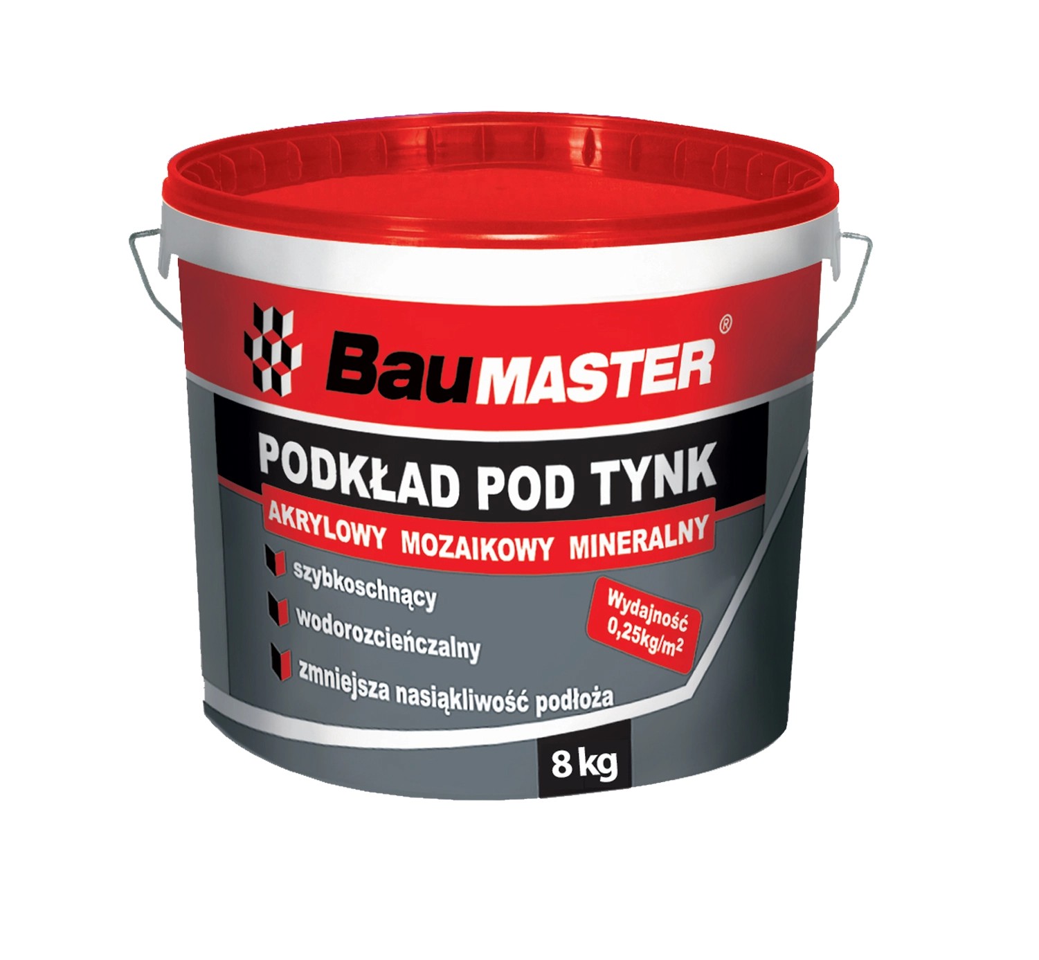 Gotowy do użycia podkład pod tynk, wykonany na bazie żywic akrylowych, płytko penetrujący środek, przeznaczony do gruntowania podłoży pod tynki strukturalne. Służy do impregnowania, wzmacniania i zwiększania przyczepności podłoża. Podkład Baumaster można stosować na tynki cementowo-wapienne,beton, gazobeton, azbestocement, gips oraz na płyty gipsowo-kartonowe. Przeznaczony jest do stosowania wewnątrz i na zewnątrz pomieszczeń.