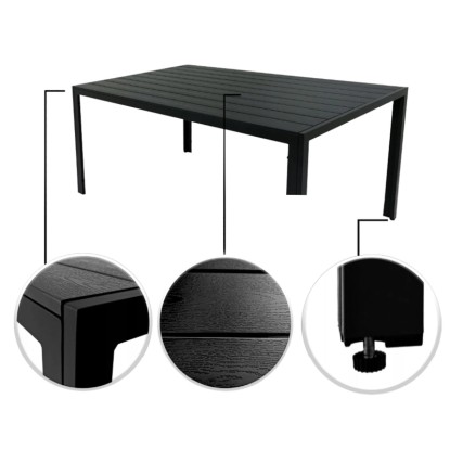 Blat stołu został wykonany z tworzywa polywood, które wygląda jak drewno, ale w przeciwieństwie do niego posiada dużą odporność na działanie warunków zewnętrznych. Dodatkowo polywood może zostać poddane recyklingowi.