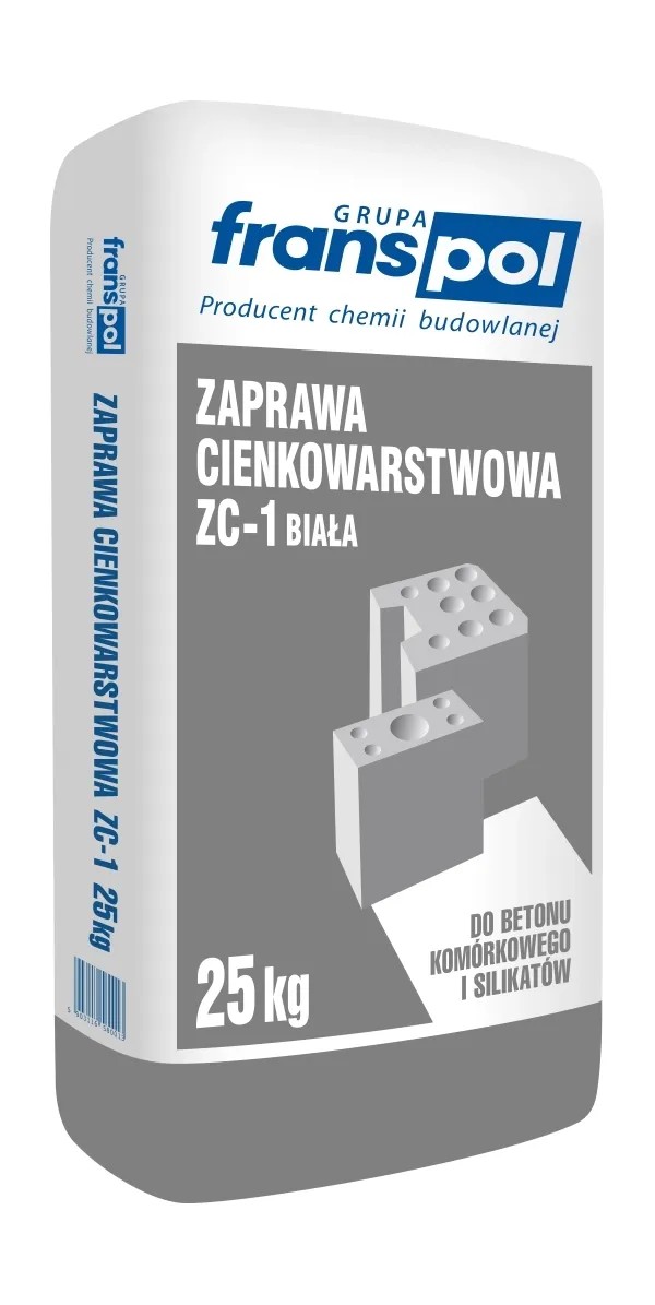 Zaprawa Cienkowarstwowa ZC-1 biała jest fabrycznie przygotowaną suchą mieszanką klejową na bazie wyselekcjonowanych kruszyw, wysokiej jakości cementów i dodatków, gotową do użycia po dodaniu wody. Służy do klejenia bloczków silikatowych, gazobetonowych w systemie łączenia na pióro wpust, łączeniem bocznym i gładkim. Do cienkowarstwowego murowania ścian wewnątrz i na zewnątrz budynków.