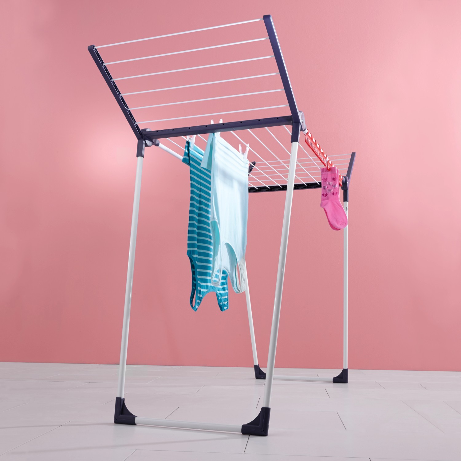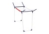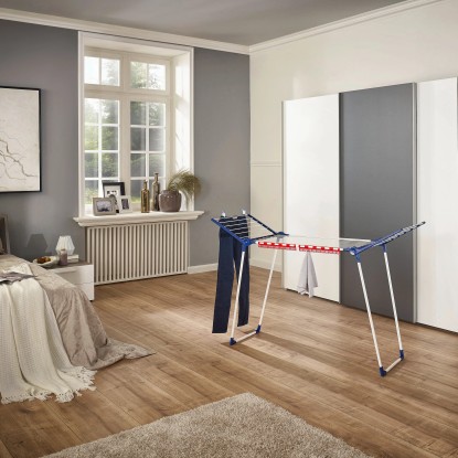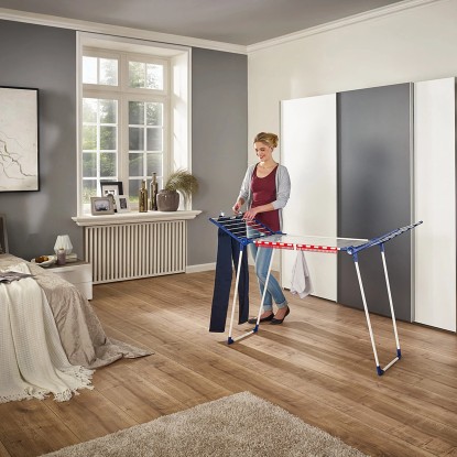 Suszarka Pegasus 150 Solid Slim marki Leifheit została wykonana z nierdzewnego metalu lakierowanego proszkowo oraz uzupełniona elementami z tworzywa sztucznego niepodatnego na odkształcanie pod wpływem ciepła i promieniowanie UV. Suszarkę można wykorzystywać zarówno w domu, jak i na tarasie, balkonie czy w ogrodzie. Dzięki szerokości 55 cm, suszarkę można zmieścić nawet w niewielkim mieszkaniu, nie będzie problemu z przeniesieniem jej przez wąskie balkonowe drzwi czy korytarze. Równolegle rozstawiane nogi tego modelu gwarantują bardzo dobrą stabilność podczas wietrznej pogody lub nierównomiernego rozłożenia prania. Podstawa nóg została zabezpieczona plastikowymi nakładkami, które chronią przed zarysowaniem o podłoże.