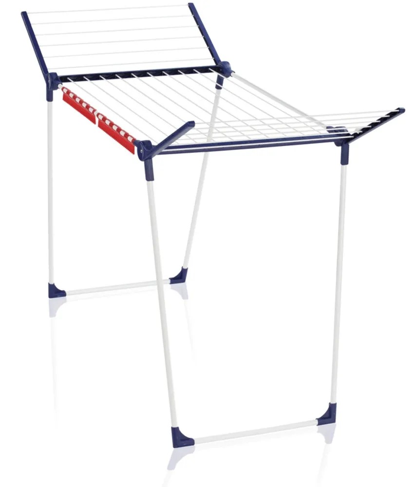 Suszarka Pegasus 180 Solid marki Leifheit to niezwykle wytrzymały produkt umożliwiający suszenie prania w bardzo komfortowy sposób. Model ten został wykonany z odpornych na warunki atmosferyczne materiałów, dlatego też może być wykorzystywany lub przechowywany nie tylko w domu, ale również na balkonie, tarasie czy w ogrodzie. Metalowe elementy suszarki zostały pomalowane na biało metodą proszkową, dzięki czemu są zabezpieczone przed korozją, natomiast granatowe elementy z tworzywa sztucznego cechuje wysoka odporność na odkształcenia. Równolegle rozstawiane nogi modelu Pegasus zapewniają bardzo wysoką stabilność nawet przy silnym wietrze i małym lub jednostronnym obciążeniu - pranie może być powieszone na jednym skrzydle suszarki i nie wpłynie to na jej równowagę. Nogi uzupełniono nakładkami ze sztywnego plastiku, które zabezpieczają metalowe elementy suszarki przed zniszczeniem.