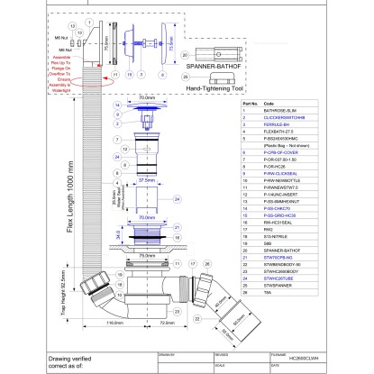 Syfon wannowy klik-klak HC2600CL firmy McAlpine to wysokiej jakości zestaw odpływowo-przelewowy przeznaczony do wanien i głębokich brodzików, który umożliwia wygodne czyszczenie od góry. Produkt wyposażony jest w system zamykania i otwierania typu "klik-klak", co zapewnia łatwą obsługę. Odejście syfonu wynosi 1.1/2"x40/50 mm, a regulowana rurka przelewowa ma długość do 1000 mm, co pozwala na elastyczne dopasowanie do różnych instalacji. Syfon wykonany jest z wytrzymałych materiałów, takich jak polipropylen, stal nierdzewna i guma, co gwarantuje jego trwałość. Produkt zapewnia przepływ wody na poziomie 50 litrów na minutę przy słupie wody wynoszącym 120 mm. Zawiera również funkcję przelewu oraz system zabezpieczenia przed nieprzyjemnymi zapachami, a długość rury odpływowej można regulować w zakresie od 40 do 100 mm.