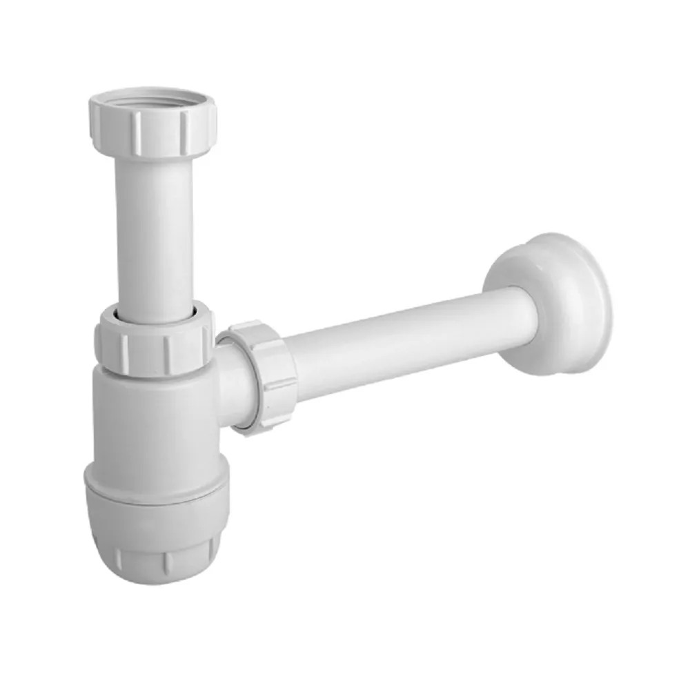 Niski, butelkowy syfon umywalkowy bez spustu.