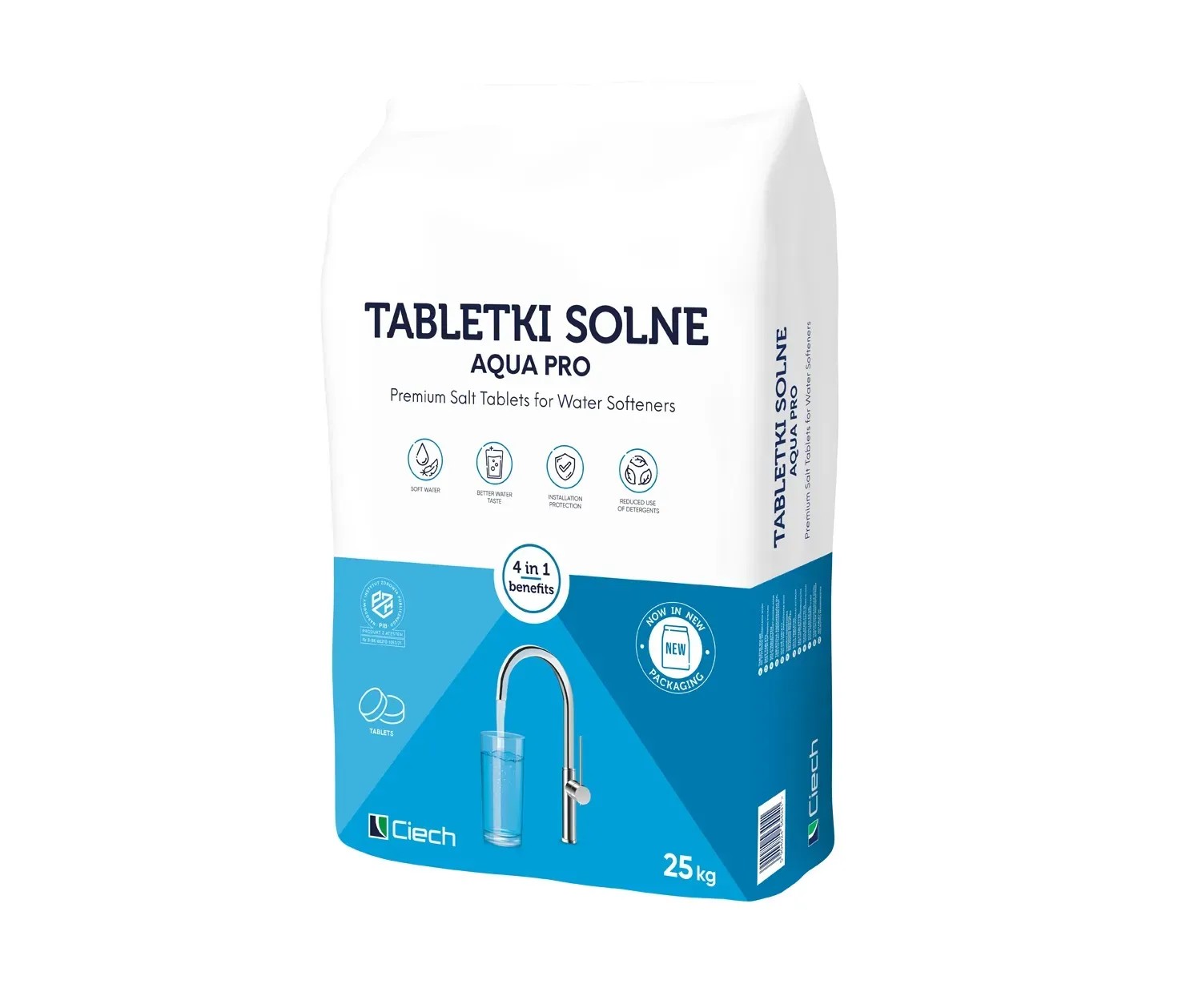 Tabletki solne w 25 kg worku wyprodukowane przez firmę Ciech przeznaczone są do uzdatniania wody. Obinżają twardość wody co pozytywnie wpływa na żywotność urządzeń któe mają kontakt z wodą. Sół pastylkowana wyprodukowana jest z soli warzonej bez dodatków substancji pochodzenia zwierzęcego czy substancji alergennych. Tabletki solne używane są w specjalnych instalacjach do zmiękczania wody zainstalowanych w min: przemysłowych stacjach uzdatniania wody, myjniach amochodowych czy też przydomowych stacjach uzdatniania wody. Odpowiednia instalacja uzdatniania wody oraz stałe użytkowanie tabletek solnych pozwala na skuteczne zmiękczenie wody, ograniczenie zużycia wody, proszków do prania, płynów zmiękczających, ochronę instalacji przed kamieniem kotłowym oraz przedłużenie żywotności sprzętu AGD.