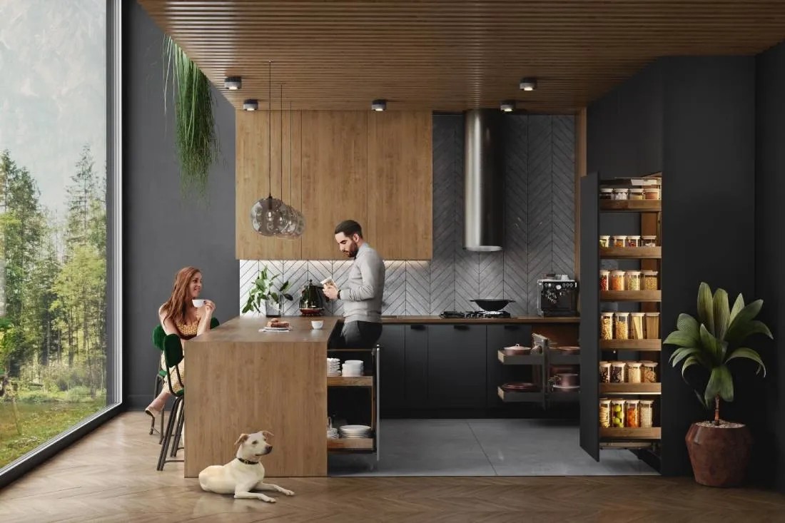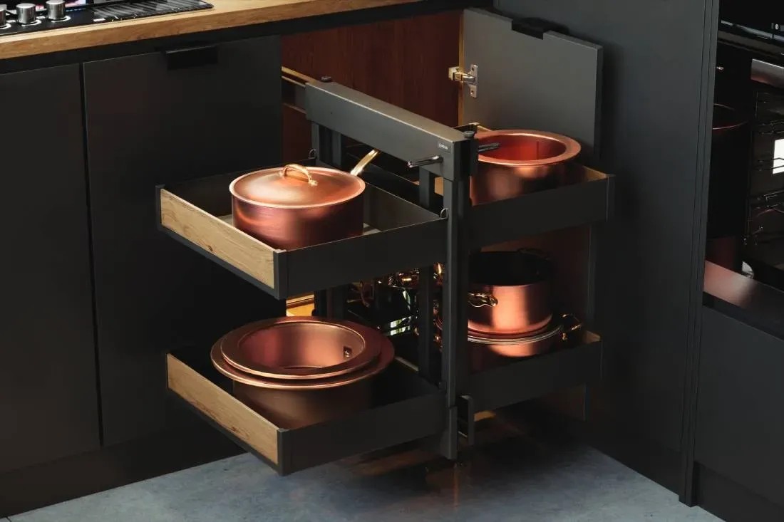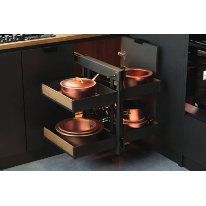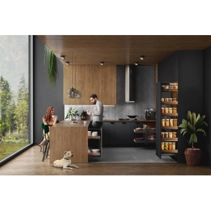 W zestawie 8 sztuk dekorów w kolorze dębu, prowadnica REJS z miękkim dociagiem prawa, stelaż umożliwiający całkowity wysuw wszystkich koszy cornera z szafki, co ułatwia dostęp do produktów.