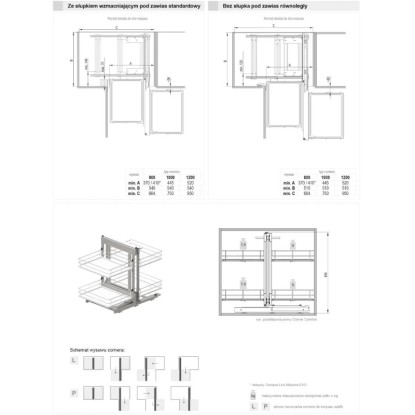 Montaż do szafki narożnej z frontem na zawiasach standardowych lub równoległych.