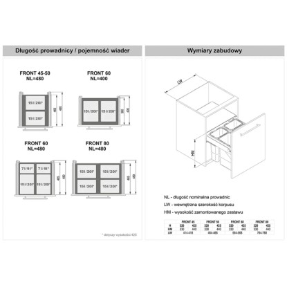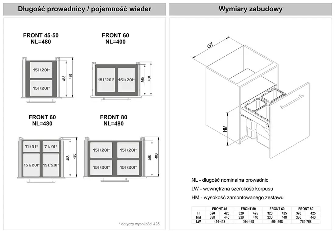 Niewątpliwą zaletą jest możliwość mocowania do frontu szafki (w komplecie). Standardowo montaż odbywa się do boków korpusu szafki. Ładowność pojemników na śmieci to maksymalnie 15 kg lub 25 kg. Pojemność wiader dla wysokości 32 cm wynosi 2x7 l + 2x15 l lub 2x15 l, zaś dla wysokości 42,5 cm wynosi 2x9 l + 2x20 l lub 2x20 l. Sprawdź pozostałe pojemniki na Obi.pl. Kliknij tutaj.