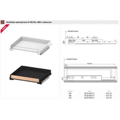 W zestawie 1 sztuka dekoru w kolorze dębu, prowadnice z miękkim dociagiem, zaślepki, mocowanie frontu lewe i prawe, mata antypoślizgowa.