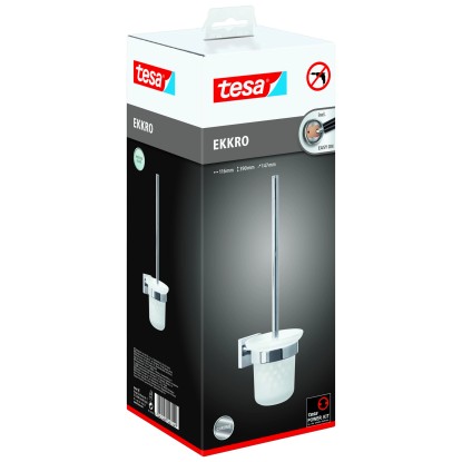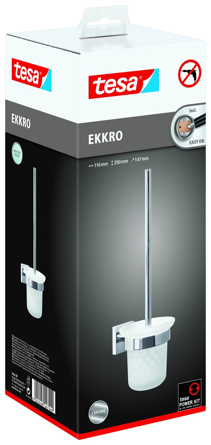 Kątowa szczotka do toalety tesa Ekkro jest zarówno piękna, jak i praktyczna. Łącząc metal pokryty chromem i satynowe szkło, jest atrakcyjna i elegancka. Ponadto, będąc montowana na ścianie, oszczędza miejsce, a ponieważ zestaw szczotki do toalety jest przymocowany za pomocą kleju, nie ma żadnych uszkodzeń ściany ani płytek. Żadne wiercenie, żadne narzędzia nie są potrzebne, wystarczy adapter i klej, który wymaga 12 godzin na utwardzenie. Jeśli nadejdzie czas na remont łazienki, uchwyt na szczotkę do toalety można łatwo usunąć, nie pozostawiając żadnych śladów, i jest gotowy do ponownego użycia z nowym adapterem BK20., Uchwyt na szczotkę toaletową z technologią tesa Power.Kit (wszystko w jednym rozwiązaniu montażowym), Prostokątna elegancja, wysoki połysk, chromowany metal, satynowe szkło, Niezawodny montaż na ścianie, wodoodporny, gwarantowany nierdzewny, Działa na płytkach, metalu, kamieniu naturalnym, marmurze, betonie, drewnie, szkle i wielu rodzajach plastiku, Nie działa na tapecie, stiuku i innych powierzchniach z powłoką antyadhezyjną, Łatwo zdejmowalny bez śladu i ponownie używalny z adapterem BK20, Prosty montaż bez wiercenia, Satynowy szklany uchwyt można zdjąć do czyszczenia, Głowicę szczotki można odkręcić, wymiary produktu: 390mm x 116mm x 147mm