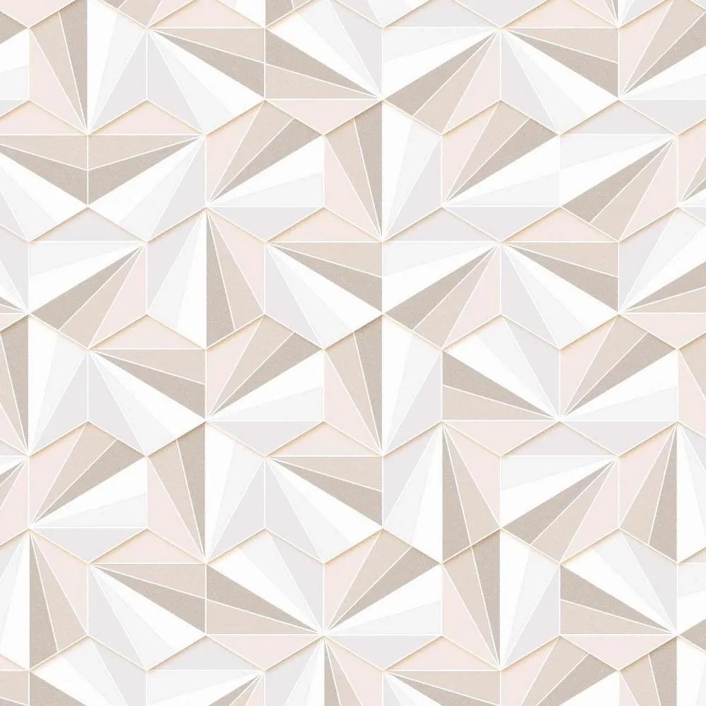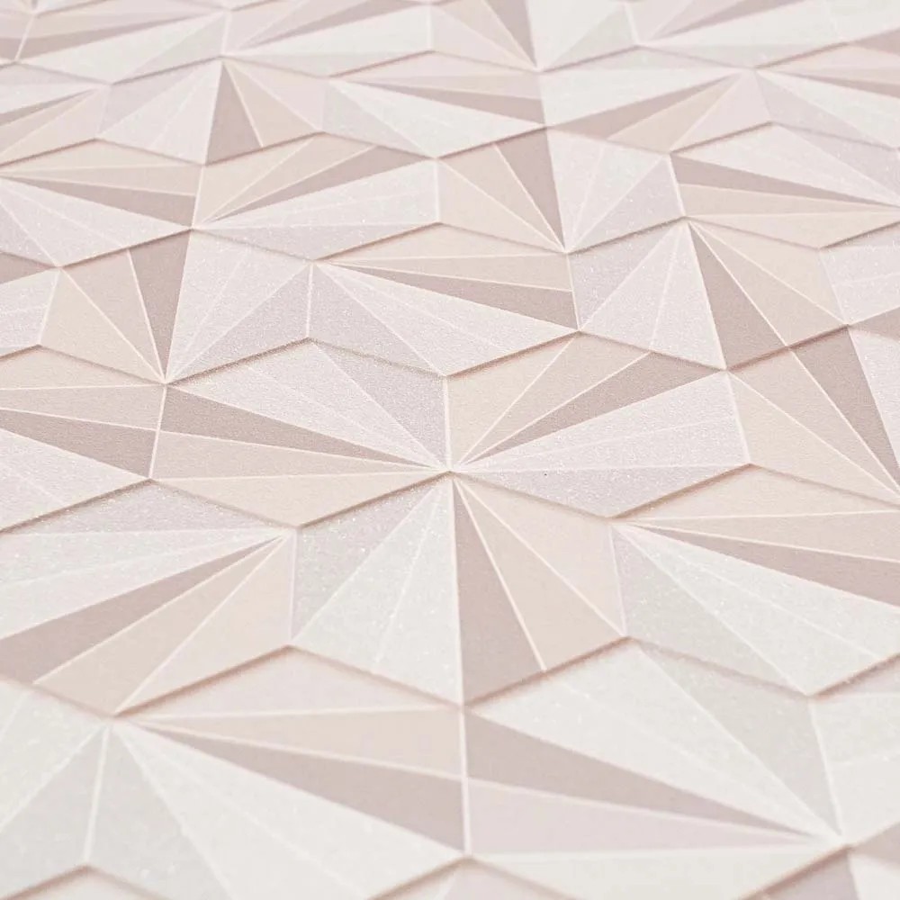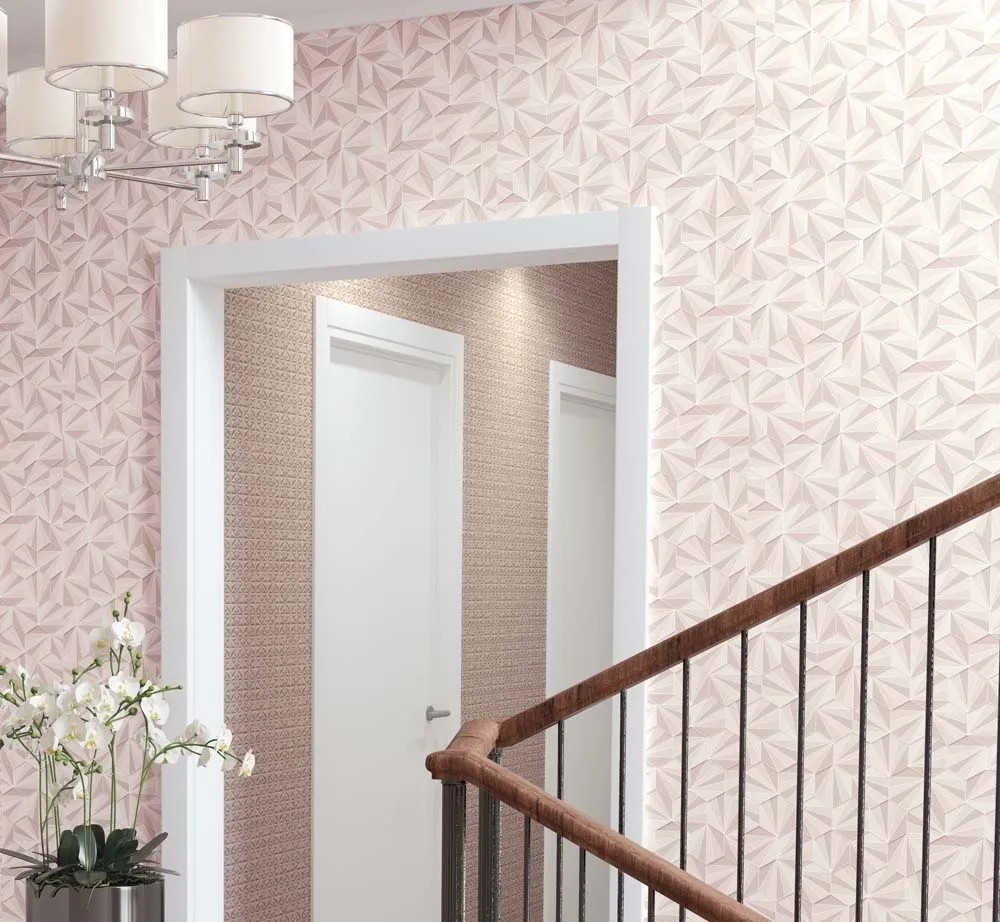 Tapetę ozdabia wzór przedstawiający trójkąty układające się w heksagony. Daje on dynamiczny, niezwykle designerski efekt. Odcienie beżu i różu spójnie się ze sobą łączą. Tapeta nawiązuje do stylistyki retro jednocześnie idealnie wpisując się w aktualne trendy.
