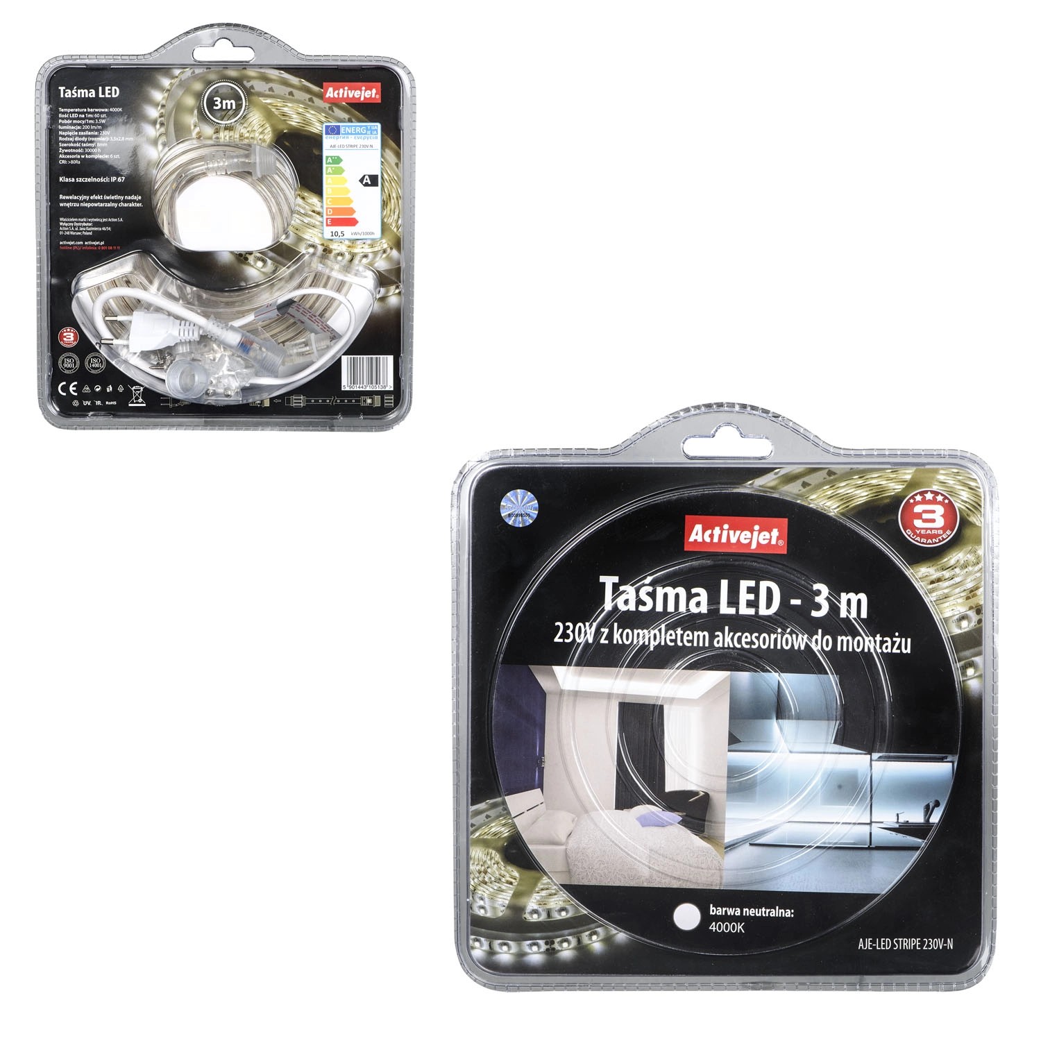 Wąż świetlny LED o długości 3 m, marki Active Jet. Jest to taśma ledowa przeznaczona do dekoracyjnego podświetlania