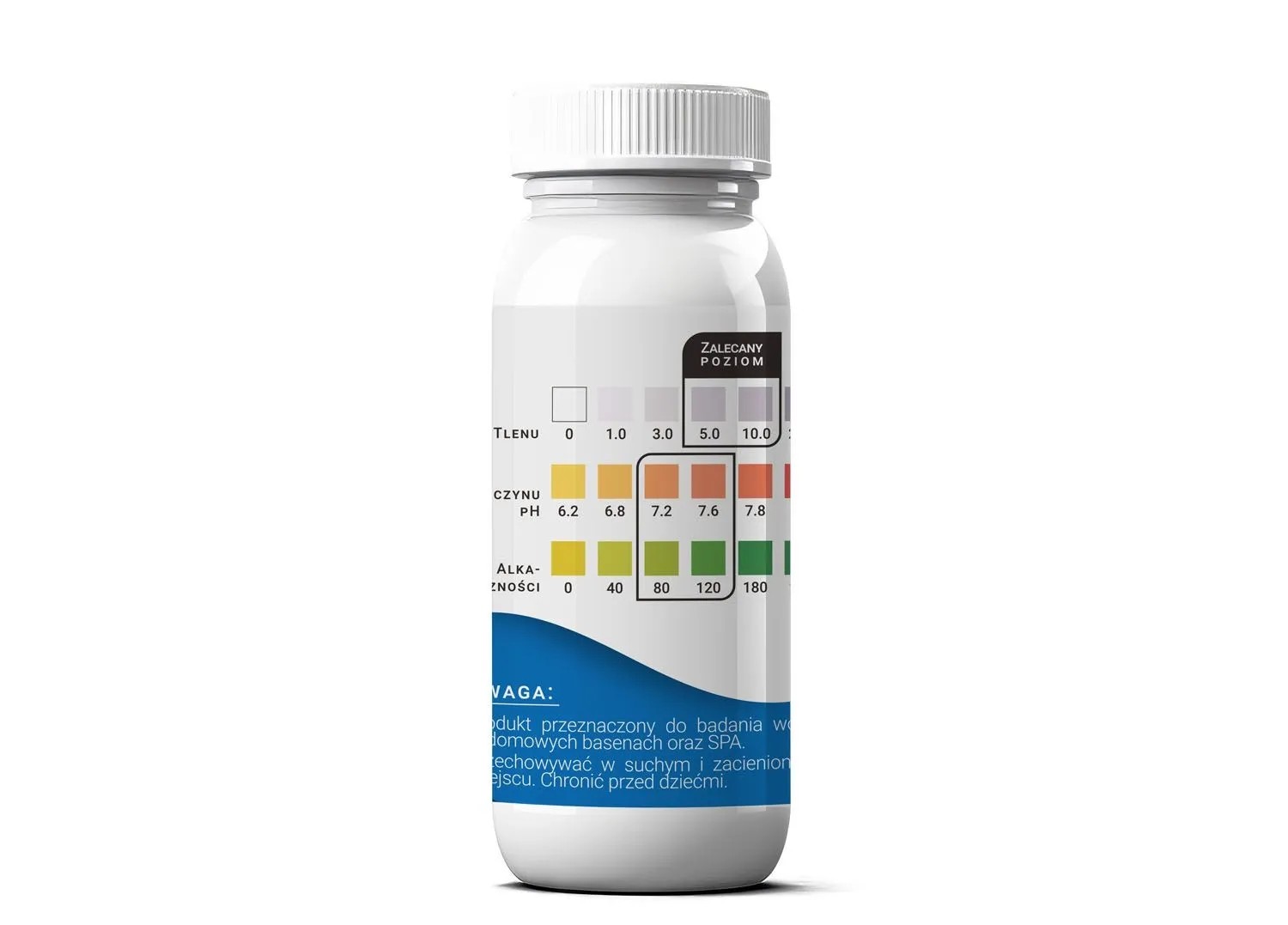 W jednym opakowaniu znajduje się zestaw praktycznych pasków testowych do regularnej kontroli jakości wody w basenie ogrodowymi lub SPA. Wystarczy zanurzyć pasek w wodzie na kilka sekund, a następnie porównać wybarwione pola z kolorową skalą na opakowaniu, aby odczytać wyniki. Dzięki temu od razu wiadomo czy konieczna jest korekta pH, czy dozowanie aktywnego tlenu lub innych środków chemicznych.