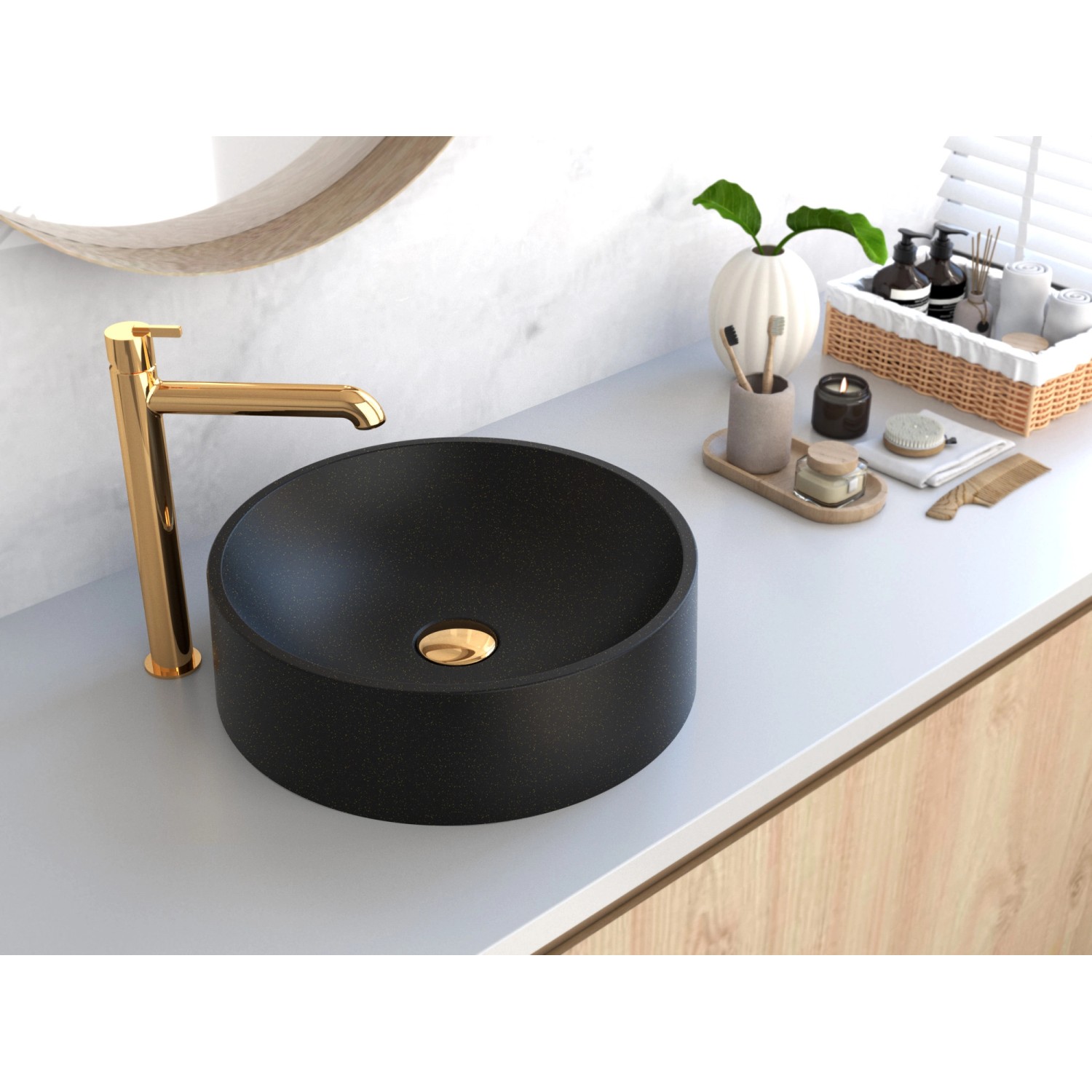 Maun 40 to okrągła umywalka o niewielkich rozmiarach, wykonana z granitu, która idealnie sprawdzi się zarówno w małej, jak i większej łazience. Model czarny z mieniącymi się złotymi drobinkami będzie nietuzinkowym akcentem w każdym łazienkowym wnętrzu.