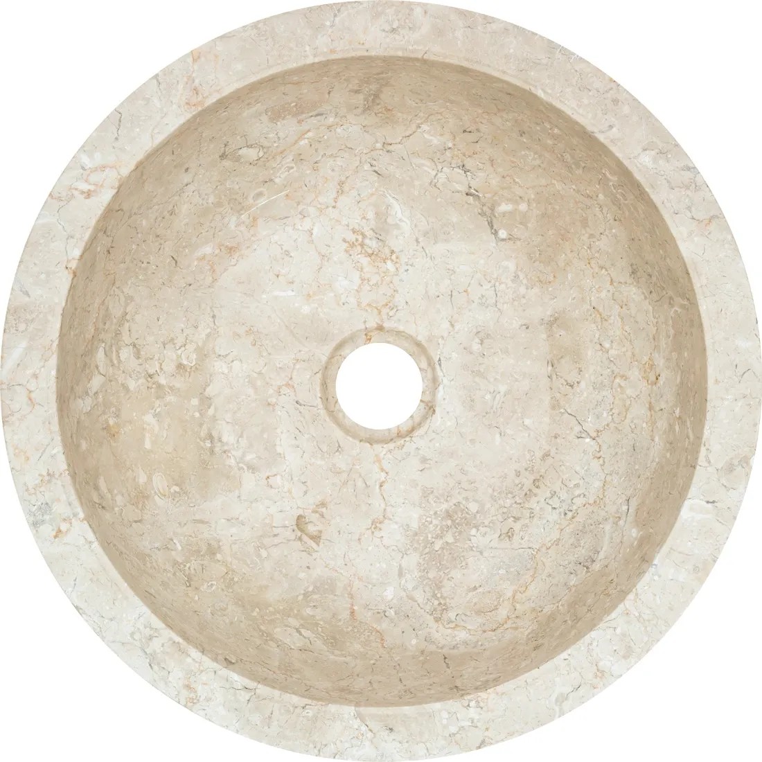 Nablatowa umywalka kamienna z okrągłą niecką, kremowa, bez przelewu. Wykonana z prawdziwego marmuru, polerowana wewnątrz. Przeznaczona do montażu na meblach łazienkowych. Unikat z naturalnego kamienia. Ta umywalka jest indywidualnym egzemplarzem, jej kolor, struktura i kształt mogą znacznie odbiegać od innych egzemplarzy. Każda umywalkę wykonano z naturalnego kamienia rzecznego. Wskazówki pielęgnacyjne: Naturalny kamień należy czyścić tylko niedużą ilością wody, z chemikaliów i środków domowych korzystać bardzo ostrożnie. W żadnym wypadku nie używać ostrych środków czystości zawierających kwasy cytrusów lub ocet. Szczotki i wełna stalowa mogą porysować naturalny kamień.