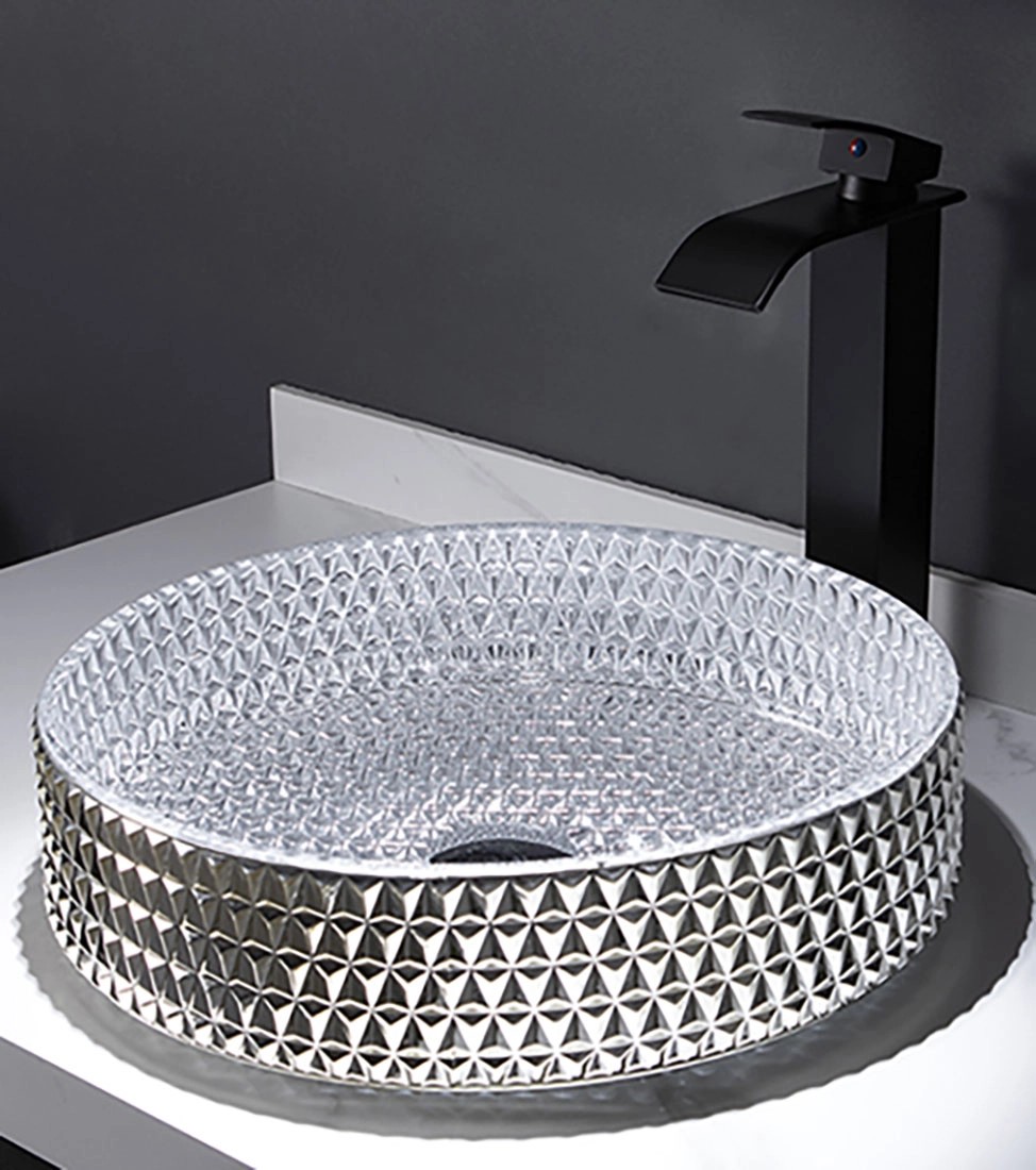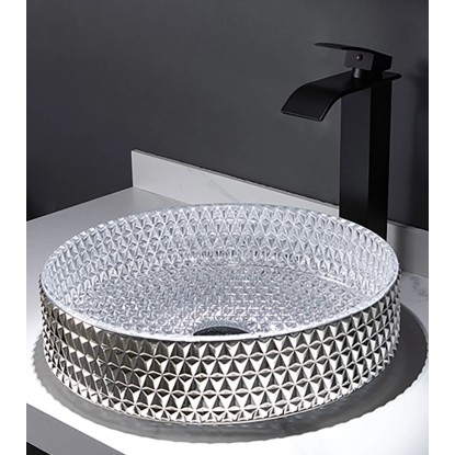 Niezwykle oryginalna szklana umywalka nablatowa o okrągłym kształcie i średnicy 40 cm będzie nie tylko modnym i funkcjonalnym rozwiązaniem do eleganckiej łazienki, ale takze prawdziwą ozdoba każdego wnętrza. Efektowny kolor i zdobiony rant umywalki doskonale wpasują się w styl glamour, a dzięki kompaktowym rozmiarom sprawdzi sie ona nawet w niewielkich pomieszczeniach.