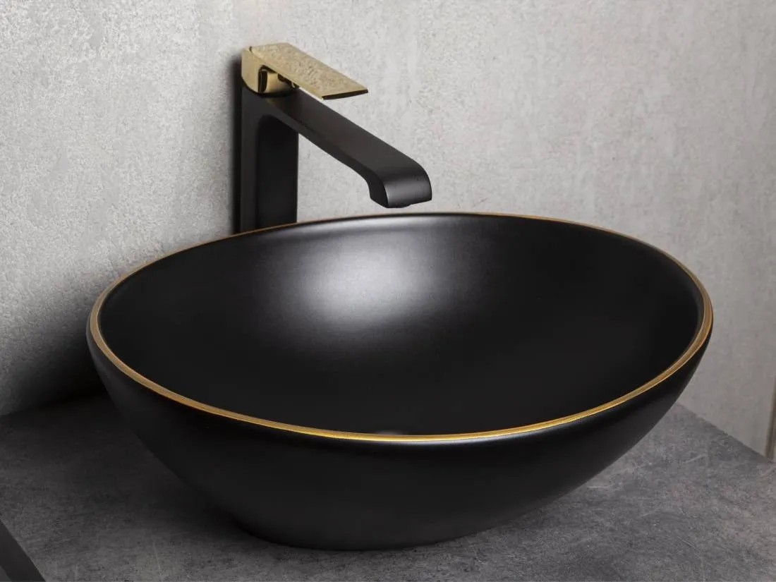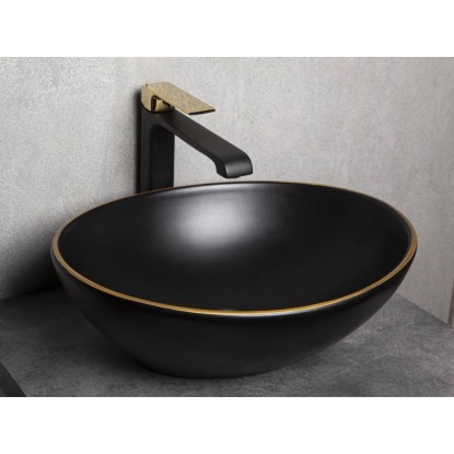 Przeznaczona do montażu na blatach umywalka ceramiczna wykończona w czarnym macie połączonym z błyszczącym złotem. Doskonale pasuje do eleganckich łazienek stanowiąc wyrazisty detal podkreślający wyjątkowość wnętrza.