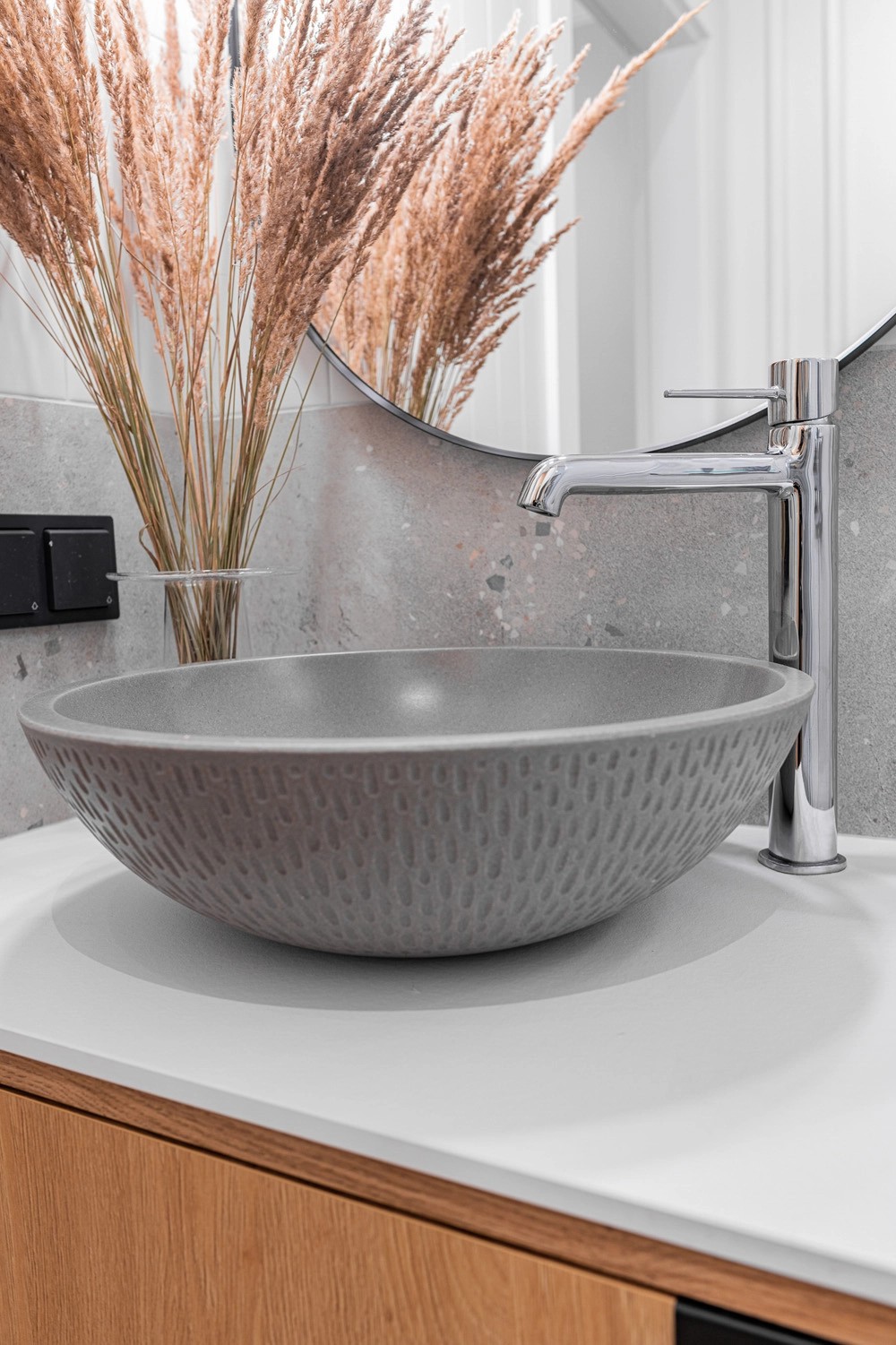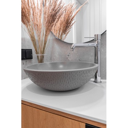 Umywalki Amber to połączenie barw i materiału, które znakomicie harmonizuje z nowoczesnym wzornictwem. Okrągły model nablatowej umywalki o średnicy 41 cm charakteryzuje się dodatkowo zdobieniami po zewnętrznej stronie misy. Poza walorami estetycznymi, umywalki Amber zapewniają szereg cech odpornościowych dzięki materiałowi z jakiego zostały wykonane. Właściwości granitu odznaczają się wytrzymałością oraz odpornością na działanie czynników zewnętrznych. Dostępne wykończenia tj. beż, szary oraz czarny wpisują się w aktualne trendy. Ten wyrazisty model pozwoli wykreować niepowtarzalną i pełną energii łazienkę. Producent udziela 10-letniej gwarancji. Produkt polski.